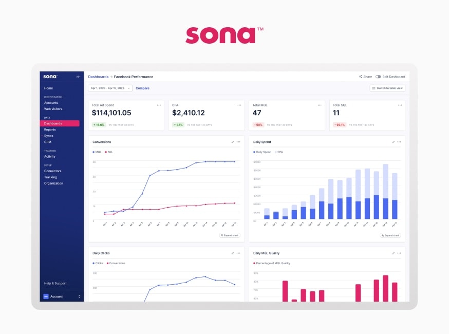 Die Attributionsfunktionen von Sona bieten Unternehmen eine zuverlässige Quelle der Wahrheit für Online- und Offline-Daten und unterstützen datengestützte Strategien. Die zentralisierten Dashboards machen wichtige Metriken leicht zugänglich und vereinfachen die Entwicklung von Strategien auf der Grundlage genauer CAC- und Lead-Daten. Insgesamt ermöglicht Sona Labs smartere Wachstumsentscheidungen mit detaillierten Einblicken.