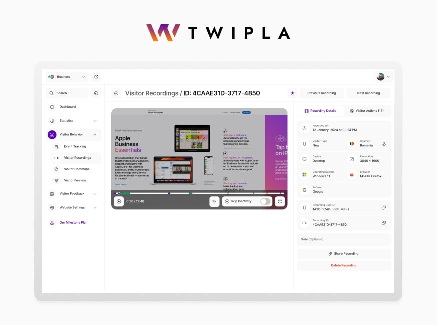 TWIPLA, eine in Deutschland ansässige Plattform mit starkem Datenschutzfokus, bietet ein komplettes Analysepaket, das mit allen globalen Datenschutzgesetzen konform ist. Die Tools liefern detaillierte Einblicke in das Besucherverhalten, Session Recordings und Customer Journeys, während gleichzeitig eine sichere und anonyme Datenverarbeitung gewährleistet wird.