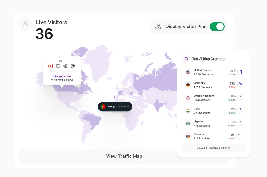 • Alle unsere Website-Statistiken und E-Commerce-Module können nach Standort gefiltert werden, sodass Nutzer geografische Daten aus dem Website-Traffic extrahieren können. Zusätzlich zeigt eine globale Karte die Standorte der Besucher bis hinunter zur Straßenebene. Diese Funktionen erstrecken sich auch auf UTM-Kampagnenanalysen, die Einblicke in die Herkunftsländer der Besucher bieten.