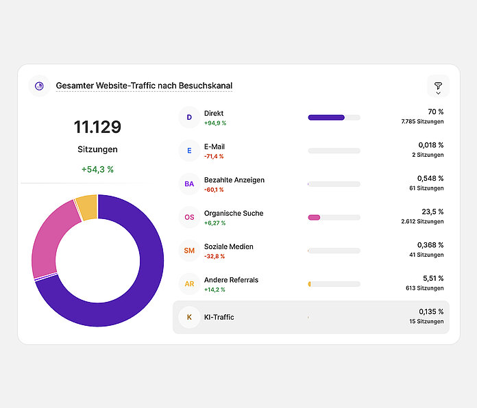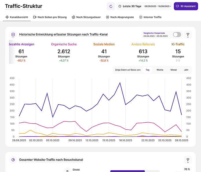 Die Traffic-Struktur bietet Ihnen detaillierte Einblicke in die Performance Ihrer verschiedenen Besucherkanäle. Ob Direktwerbung, E-Mail, bezahlte Anzeigen, organische Suche, soziale Medien, Verweisende Seiten oder nun auch Traffic, der durch KI weitergeleitet wurde – für jeden Kanal werden alle relevanten Kennzahlen übersichtlich dargestellt. Diese Daten können Sie gezielt nutzen, um Ihre Inhalte optimal auf verschiedene Besuchersegmente abzustimmen.