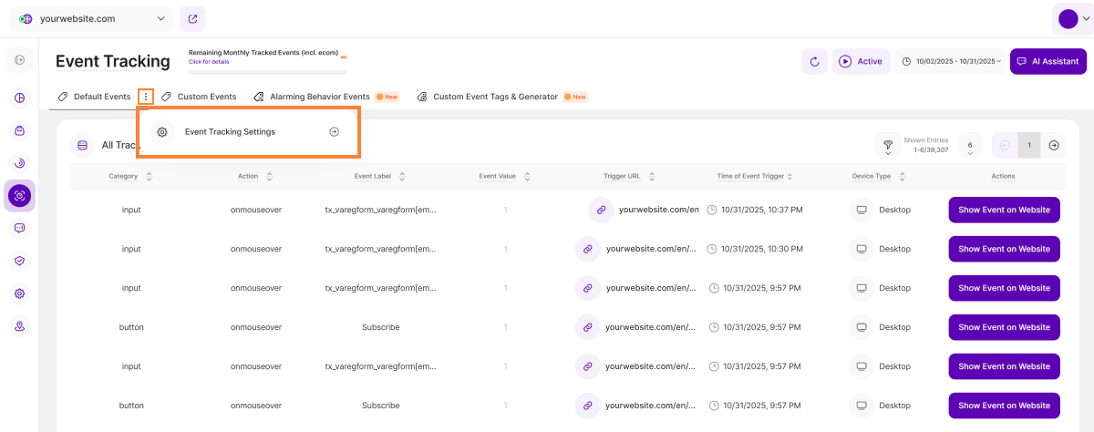 Um auf die Moduleinstellungen zuzugreifen, klicken Sie auf die Schaltfläche "Weitere Optionen" , die sich jeweils in den Tabs "Standardereignisse" und "Benutzerdefinierte Ereignisse" befindet, und wählen Sie dann "Einstellungen zur Ereigniserfassung".