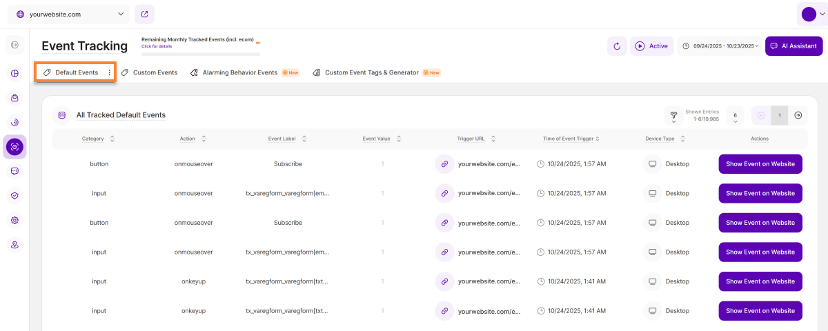 Die Ereignis-Erfassung erfasst die Besucherinteraktionen auf Ihrer Webseite, von automatisch erfassten Standardereignissen bis hin zu manuell erstellten benutzerdefinierten Ereignissen. Mit dieser Funktion können Sie genau verfolgen, wie oft Besucher im Laufe der Zeit bestimmte Aktionen auslösen.