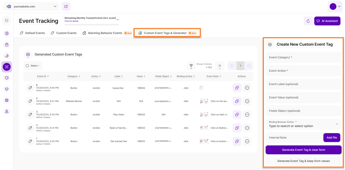 Bei einem benutzerdefinierten Ereignis handelt es sich um ein spezifisches Ereignis-Tag, das Sie oder ein anderer Webseiten-Mitwirkender generiert (bspw. anhand des Ereignis-Tag-Generators der Plattform) und manuell in den Quellcode Ihrer Webseite eingebunden hat. Wenn beim Einsetzen des Ereignis-Tags in den Quellcode der Webseite, die vorgegebenen Tag-Struktur eingehalten wird, erfasst die Plattform automatisch jeden Auslöser. Benutzerdefinierte Ereignisse erlauben Ihnen das sehr gezielte Nachvollziehen von Besucher-Interaktionen mit ausgewählten Webseiten-Elementen.