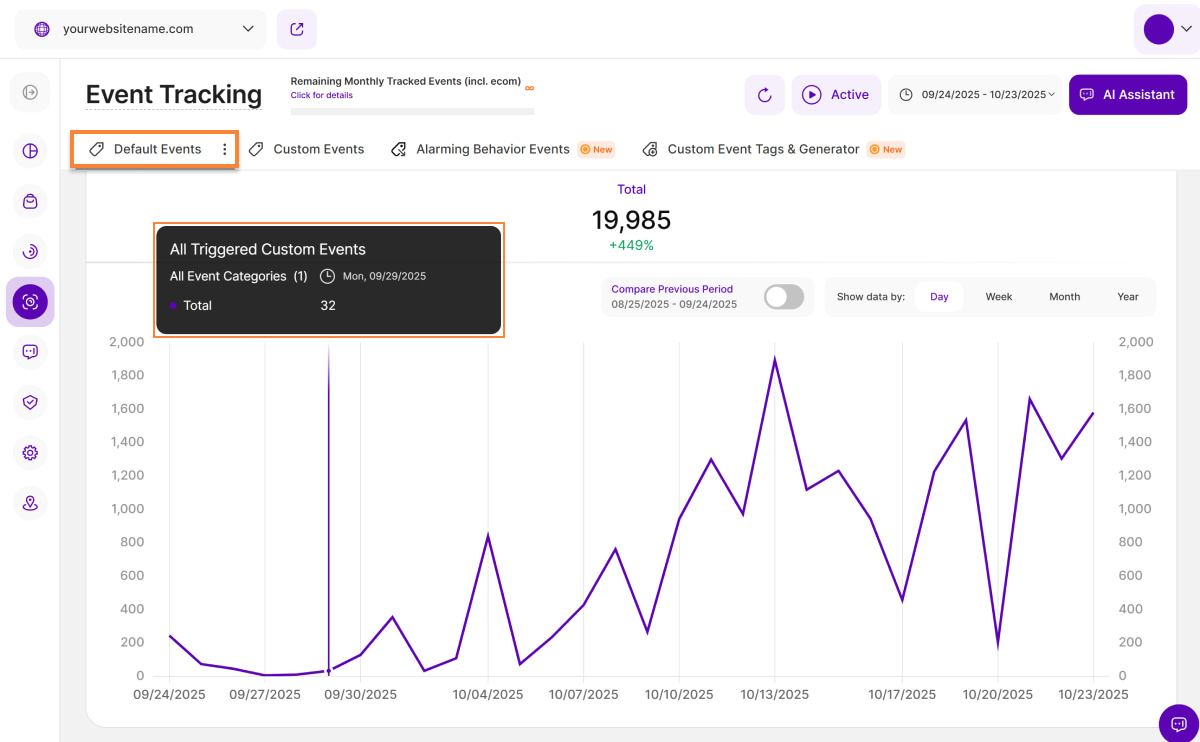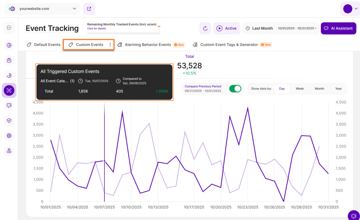 Ähnlich wie in der Ansicht "Standardereignisse" finden Sie oben rechts in diesem Abschnitt eine Optionsschaltfläche mit der Bezeichnung "Vorperiode vergleichen" (mit den entsprechenden Daten darunter). Mit dieser Schaltfläche können Sie Ihre aktuellen Daten mit dem entsprechenden Zeitraum davor vergleichen. Die Daten des vorherigen Zeitraums werden im Diagramm durch eine hellviolette Linie dargestellt.