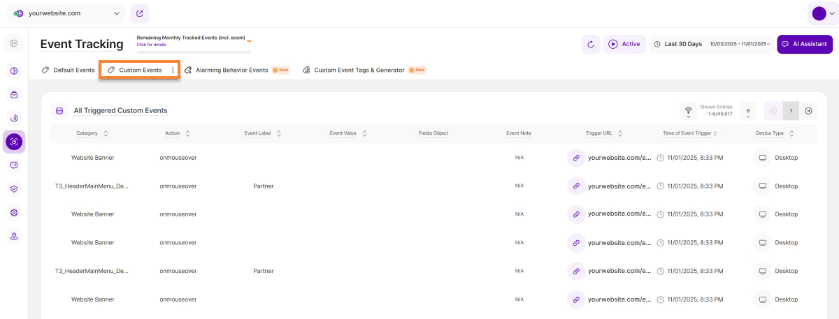 • Zeitpunkt des Ereignisauslösers: Diese Spalte zeigt das genaue Datum und die Uhrzeit, zu der das Ereignis auf Ihrer Webseite ausgelöst wurde.