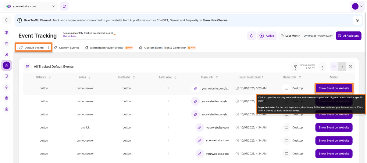 4. Auslösersummen & alle automatisch verfolgten Standard-Ereignisse anzeigen: Wenn Sie diese Option aktivieren, werden alle Standardelemente hervorgehoben, die von unserem System automatisch erkannt werden können (nur für Sie in diesem Live-Tracking-Modus sichtbar). Außerdem sehen Sie eine Summe aller Ereignisauslöser für jedes hervorgehobene Element im ausgewählten Zeitraum. Wenn Sie auf diese Auslösersummen klicken, erhalten Sie weitere Details darüber, wie diese Summe zustande kommt.