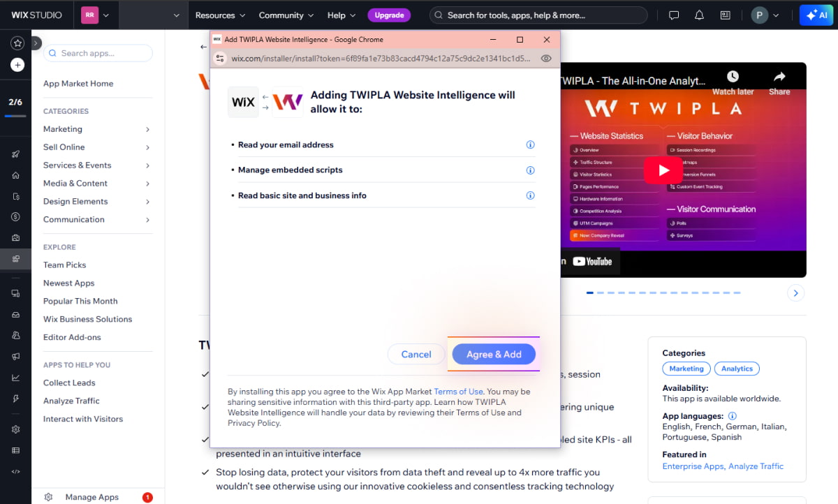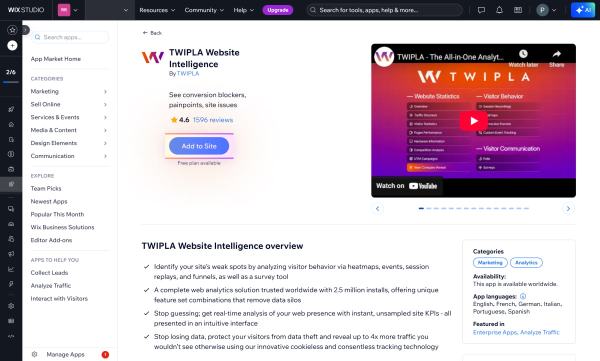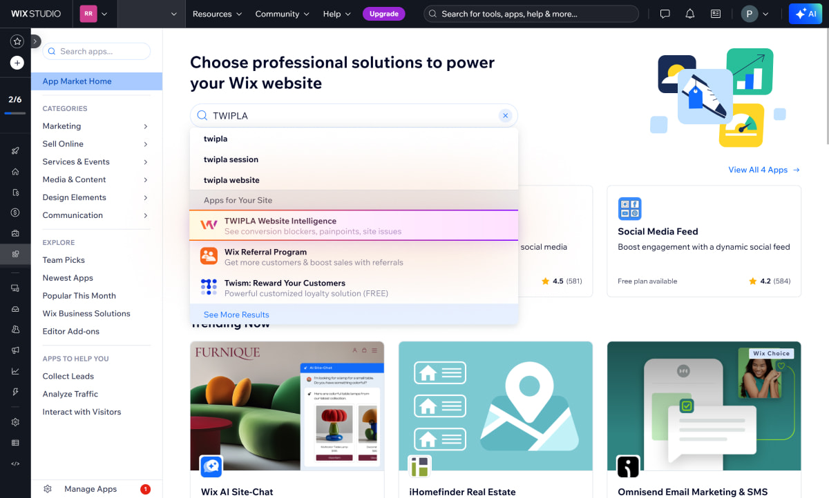 Bringen Sie TWIPLA schnell auf Ihre Wix-Website! Installieren Sie einfach das TWIPLA Website Intelligence Plugin aus dem Wix App Market und folgen Sie dann unserer Schritt-für-Schritt-Installationsanleitung unten.