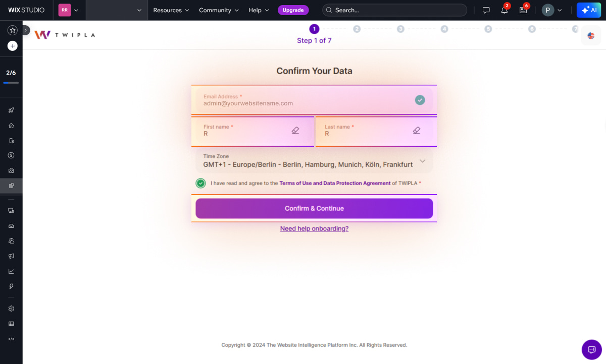 6. Sie werden zum Einführungsbildschirm weitergeleitet, um Ihre Angaben zu bestätigen und Ihr Konto einzurichten. Die E-Mail-Adresse Ihres Wix-Kontos wird automatisch verwendet und kann nicht geändert werden. Geben Sie Ihren Vor- sowie Nachnamen ein und wählen Sie Ihre Zeitzone aus. Aktivieren Sie das Kontrollkästchen, um den Nutzungsbedingungen und der Datenschutzvereinbarung zuzustimmen und klicken Sie anschließend auf "Bestätigen & Fortfahren".