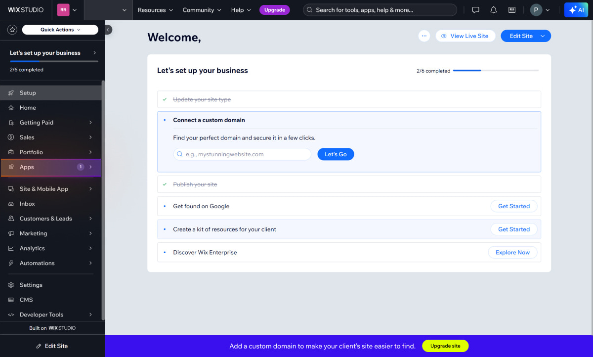 2. Nachdem Sie die Website ausgewählt haben, werden Sie zum Sites-Dashboard weitergeleitet. Wählen Sie Apps aus dem Menü auf der linken Seite, um den App Market zu öffnen.