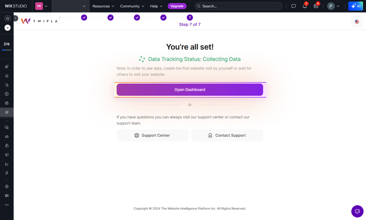 12. Sie sind fertig! Klicken Sie auf Dashboard öffnen, um auf Ihre Haupt-Dashboards zuzugreifen. Um die Erfassung ihrer Webseiten-Besuche zu bestätigen, besuchen Sie Ihre Live-Website und laden Sie das Dashboard erneut, um Ihre ersten Statistiken zu sehen.