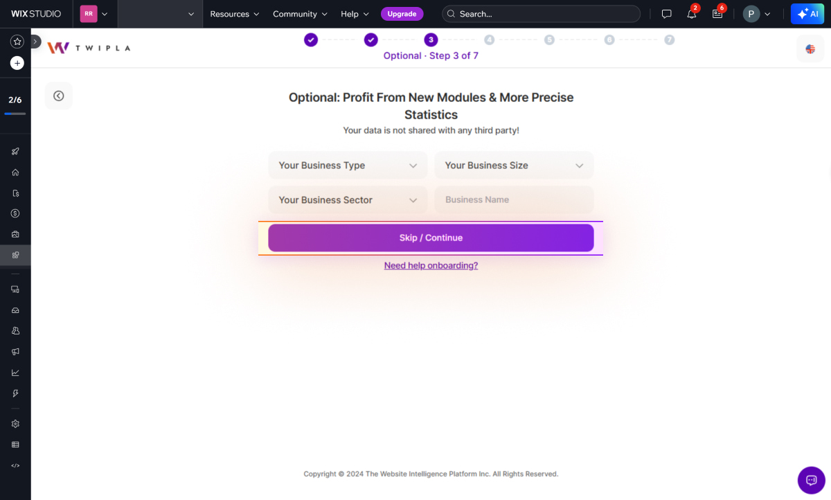 8. Dieser Schritt ist optional. Verbessern Sie Ihre Datenlage bspw. für die Wettbewerbsfunktion, indem Sie Ihre Unternehmensart, Größe, Branche und Ihren Namen angeben. Diese Daten bleiben vertraulich und werden nicht an Dritte weitergegeben! Wenn Sie diese Informationen weitergeben, erhalten Sie Zugang zu neuen Modulen und genaueren Statistiken.