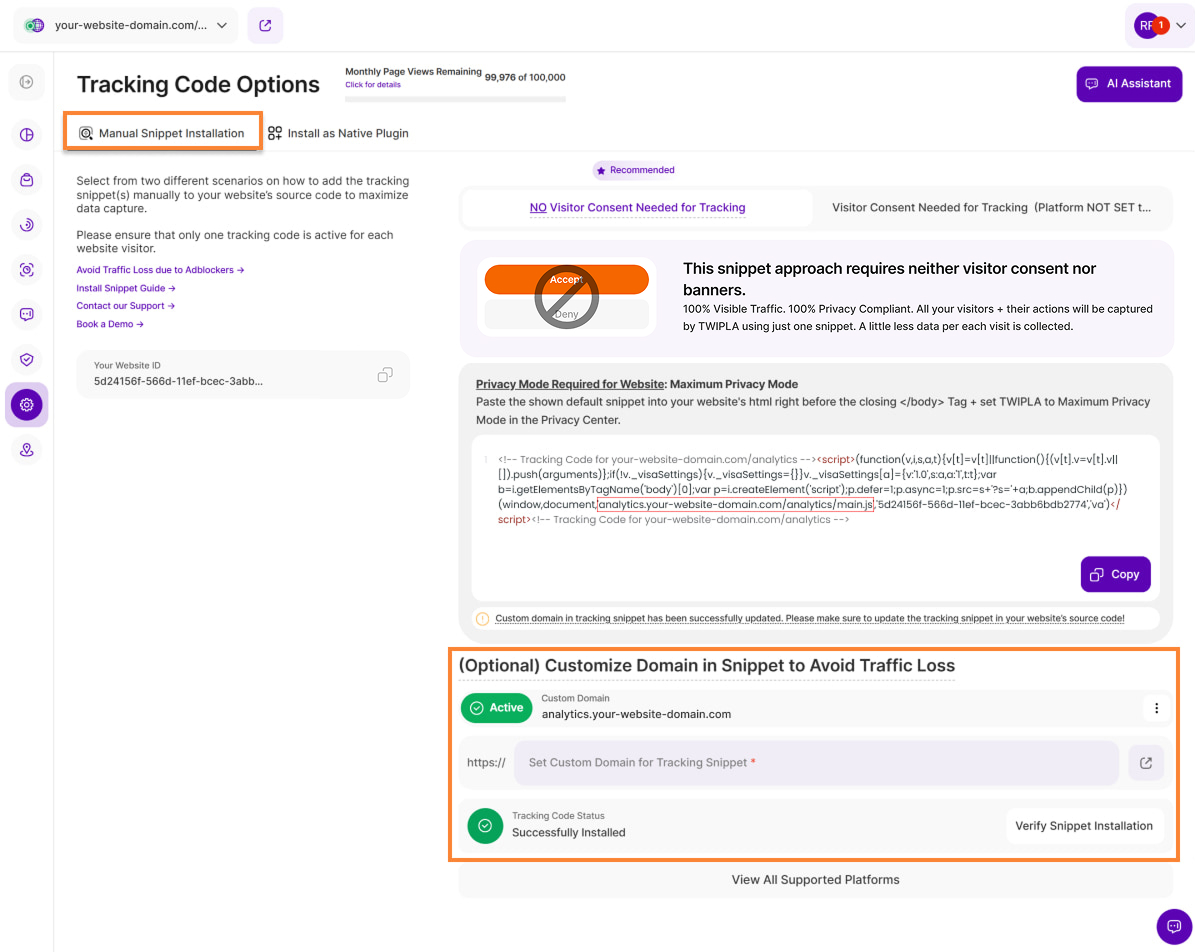 Ist die manuelle Einrichtung einer eigenen Domain für den Tracking-Code, innerhalb der Plattform, erforderlich?JaJaNein