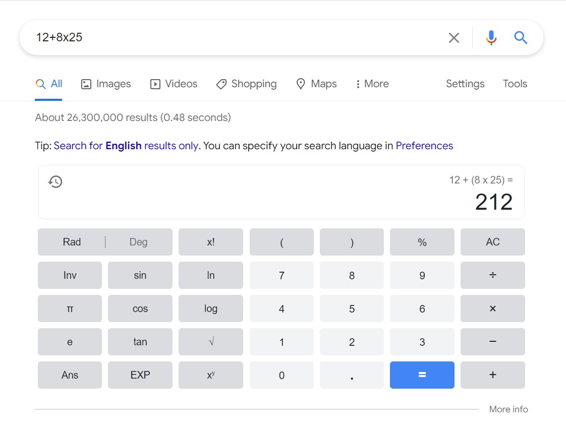 For example here is how tofind your answer for 12+8x25: