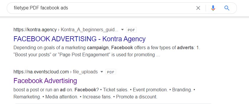 Use the “filetype:” command to search for specific content formats.