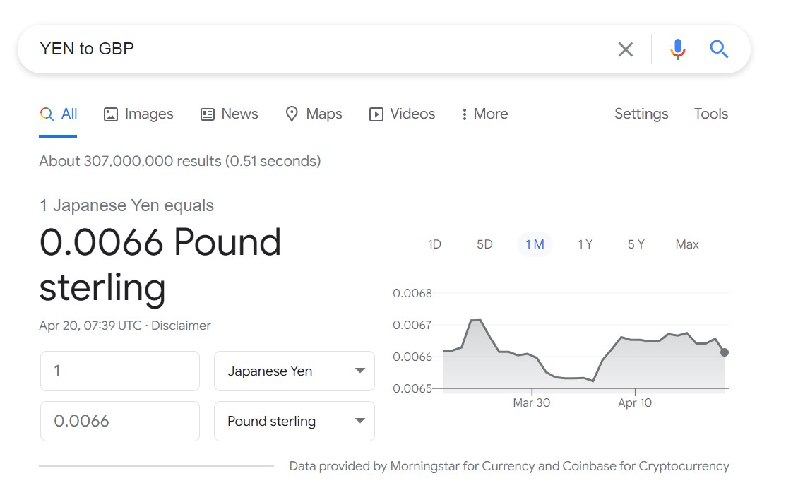 Type in  “YEN to GBP” and add your amount: