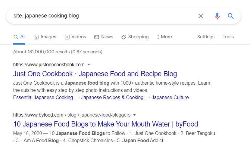 Now let’s say you are continuing your food-related article but this time you need to find websites that have blogs related to Japanese cooking.