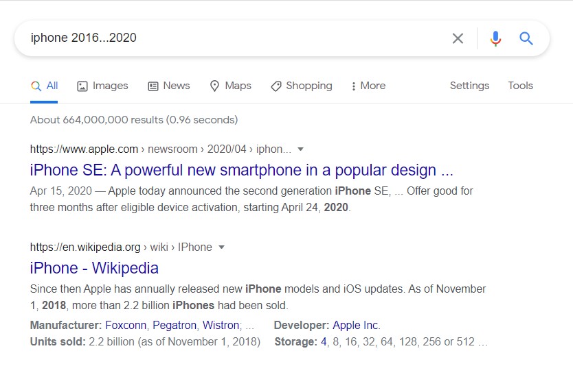 Let’s say you need to find result pages about iPhones that were published between 2016 and 2020.