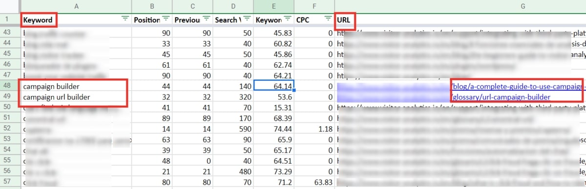 Use a tool to see your site’s organic keywords list and export it to a spreadsheet. Then, filter the results so that the keyword column is in alphabetical order. Then, you will be able to determine if any pages or URLs are targeting the same keyword or very similar keywords. If that is the case, you’ve got yourself a case of keyword cannibalization.