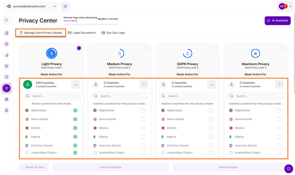 • The "Save Changes” button becomes active when the user makes any changes to country statuses or the privacy modes. If no changes are made, the button will appear grayed out.