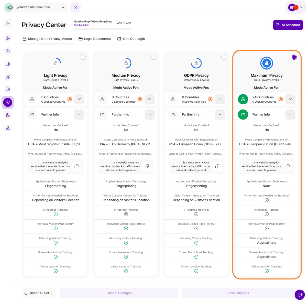 We have four levels of privacy that our website owners can choose from. By default, the Maximum Privacy mode is activated for each new website. Get to know more about each level and the data that will be collected from visitors: