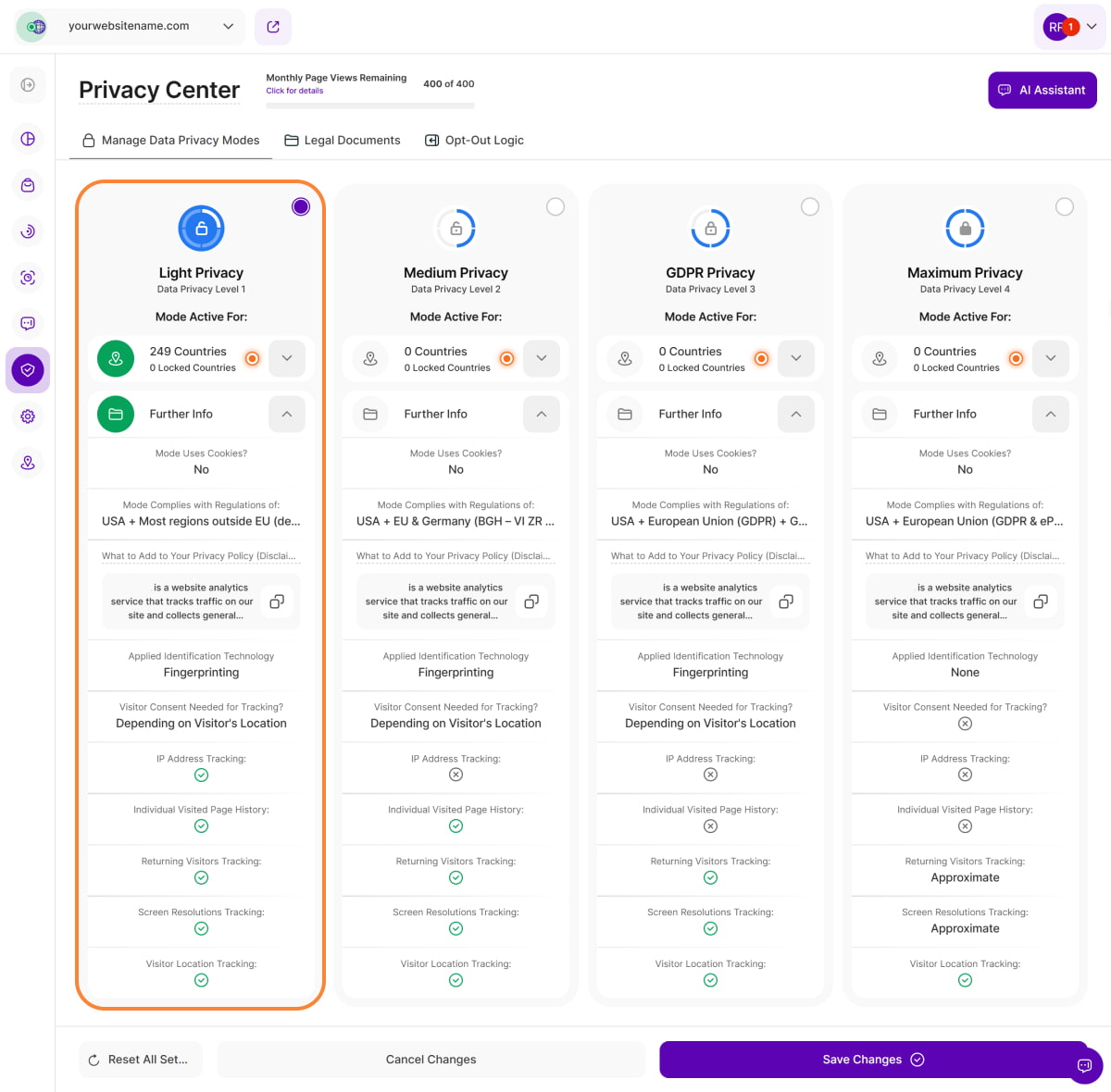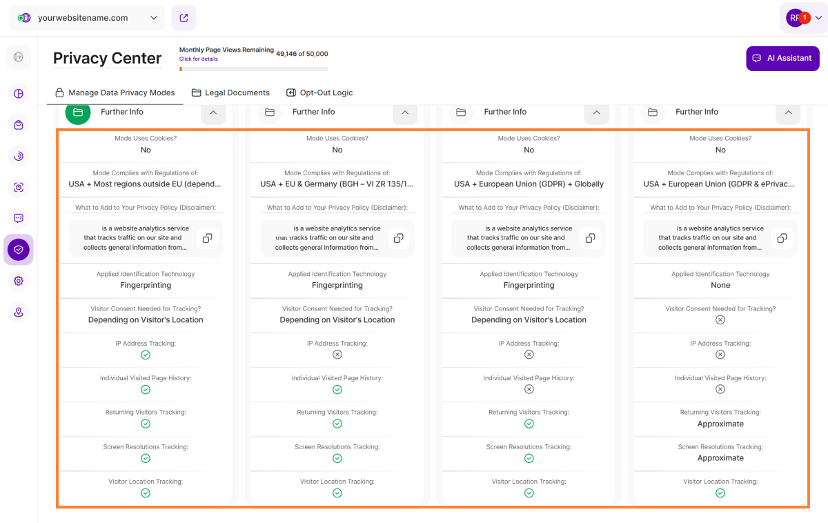 We implemented a cookieless tracking system that applies to all data privacy modes. You'll also find the following information, such as the regulations each level is compliant with, What to Add to Your Privacy Policy (Disclaimer), Identifying Technology Used, and Visitor Consent Needed for Tracking. This would help you better understand which level would suit your website's needs the most while staying compliant with the regulations of each country.