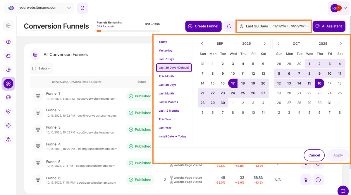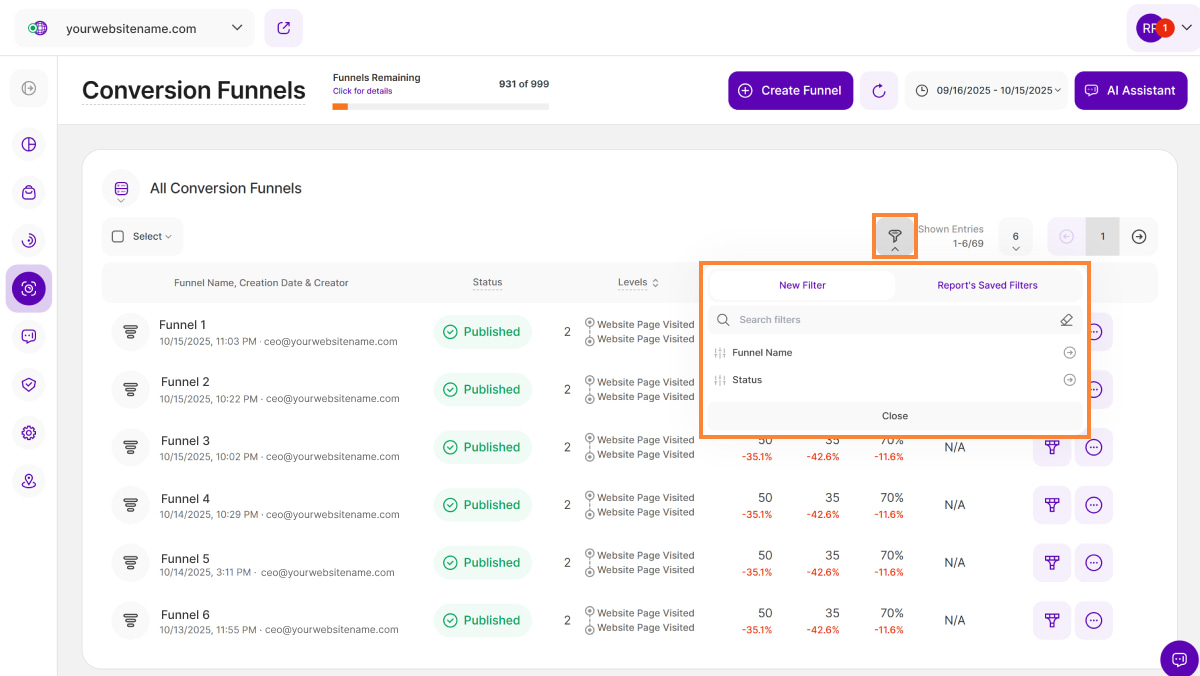• View Funnel Details: Click this icon to enter the detail view of the selected funnel.