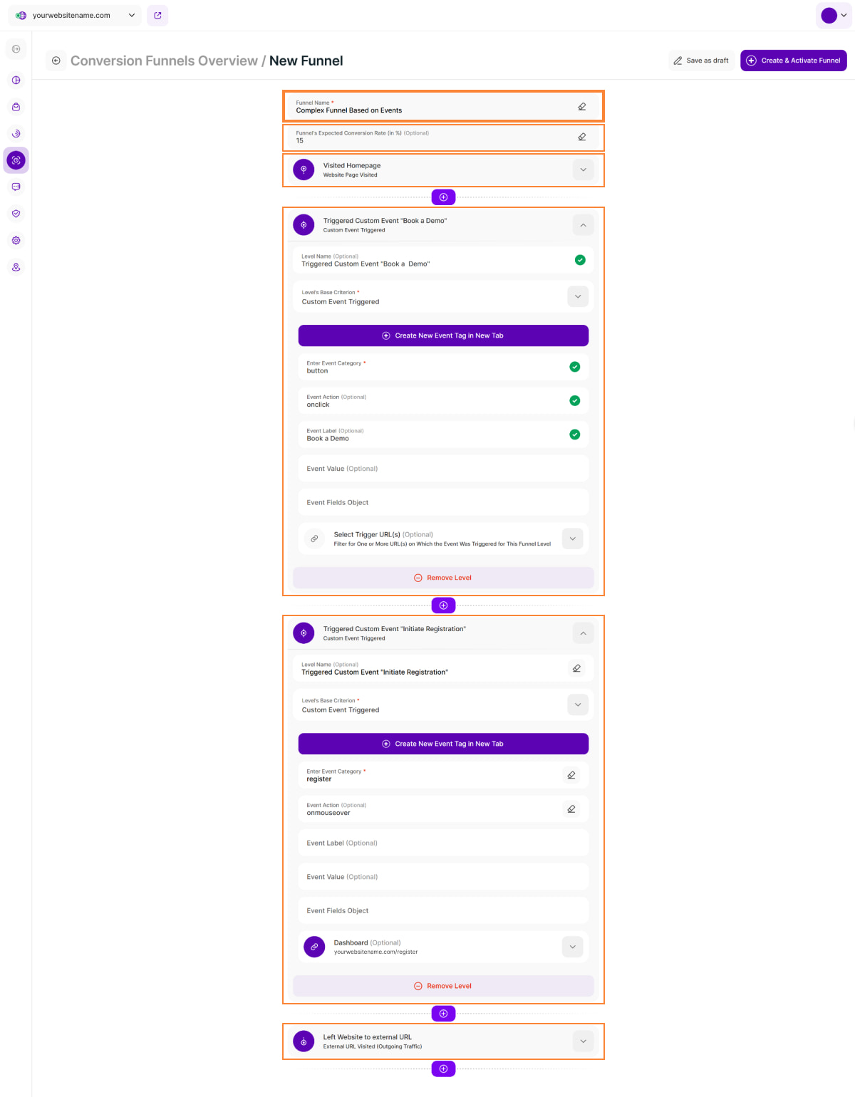 4. Left website to external URL: This final level tracks visitors who navigated to a specific external URL after engaging with the demo booking and registration processes. Utilizing the External URL Visited (Outgoing Traffic) base criterion with the target URL defined, this step is crucial for understanding the broader conversion journey and its relation to your primary goals (like demo bookings or registrations).