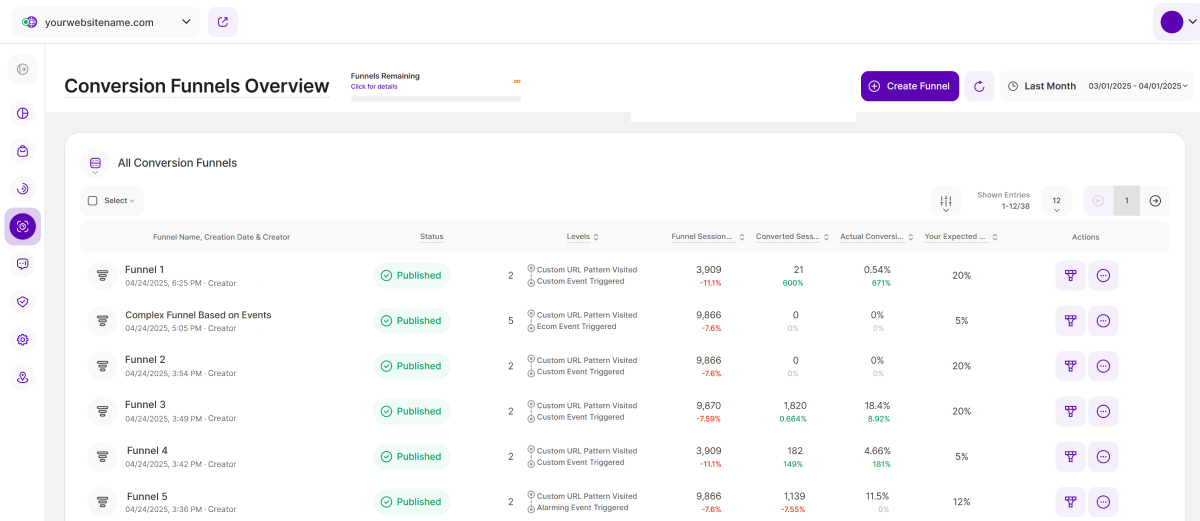 • Published: Funnels that have been published and gathering data. Note that unlike heatmaps, there is NO possibility to pause the collection of data.