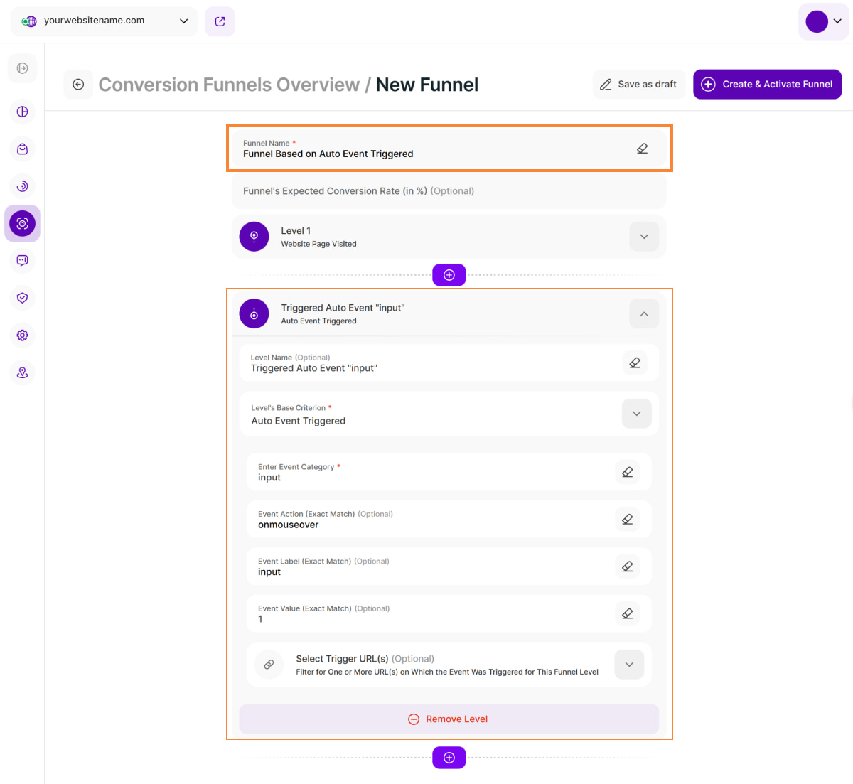 • Select Trigger URL(s) (Optional): While custom events track actions regardless of the page, you can optionally narrow down the scope of this funnel level to specific URLs where the event might occur.
