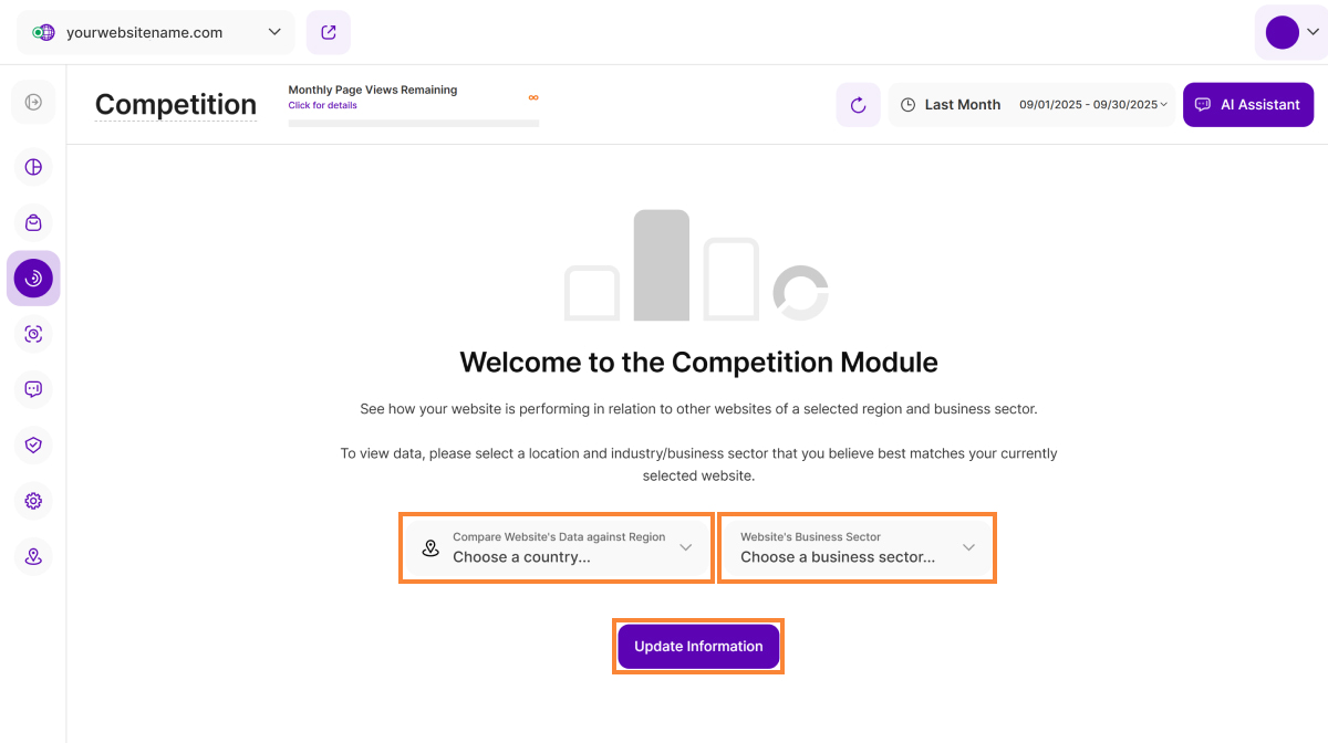 The "Competition" module helps you compare the performance of your website with other websites in your industry and region. After selecting the Competition option in the main navigation bar for the first time, a welcome screen will appear. To start viewing the competition data, please define the region or business sector of your own website in this view and then click Continue.