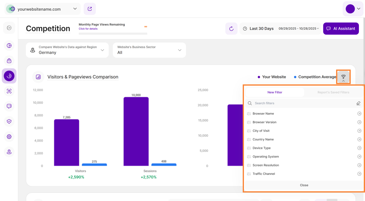 The Competition submodule provides invaluable insights, and filters are the key to unlocking a granular understanding of your performance. They are consistently available across all report blocks, giving you the power to apply one or more at once to segment and analyze your website's data with high precision.