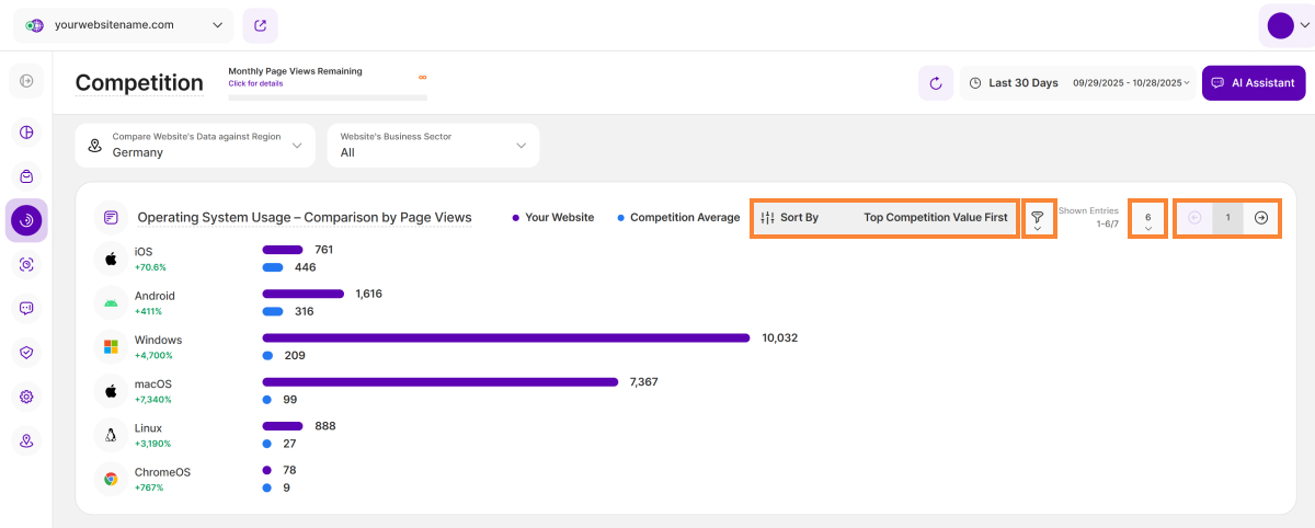 • Competition Average (Blue Bar): The average number of page views generated by visitors using that Operating System across all websites in your defined competition group.
