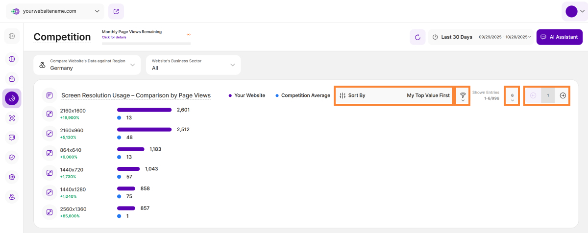 To focus your analysis, sort the data to prioritize either your top values or the competition's top values. You can also filter the data to segment it for a competitive edge. Finally, manage your view by setting the number of entries per page and navigating with pagination.
