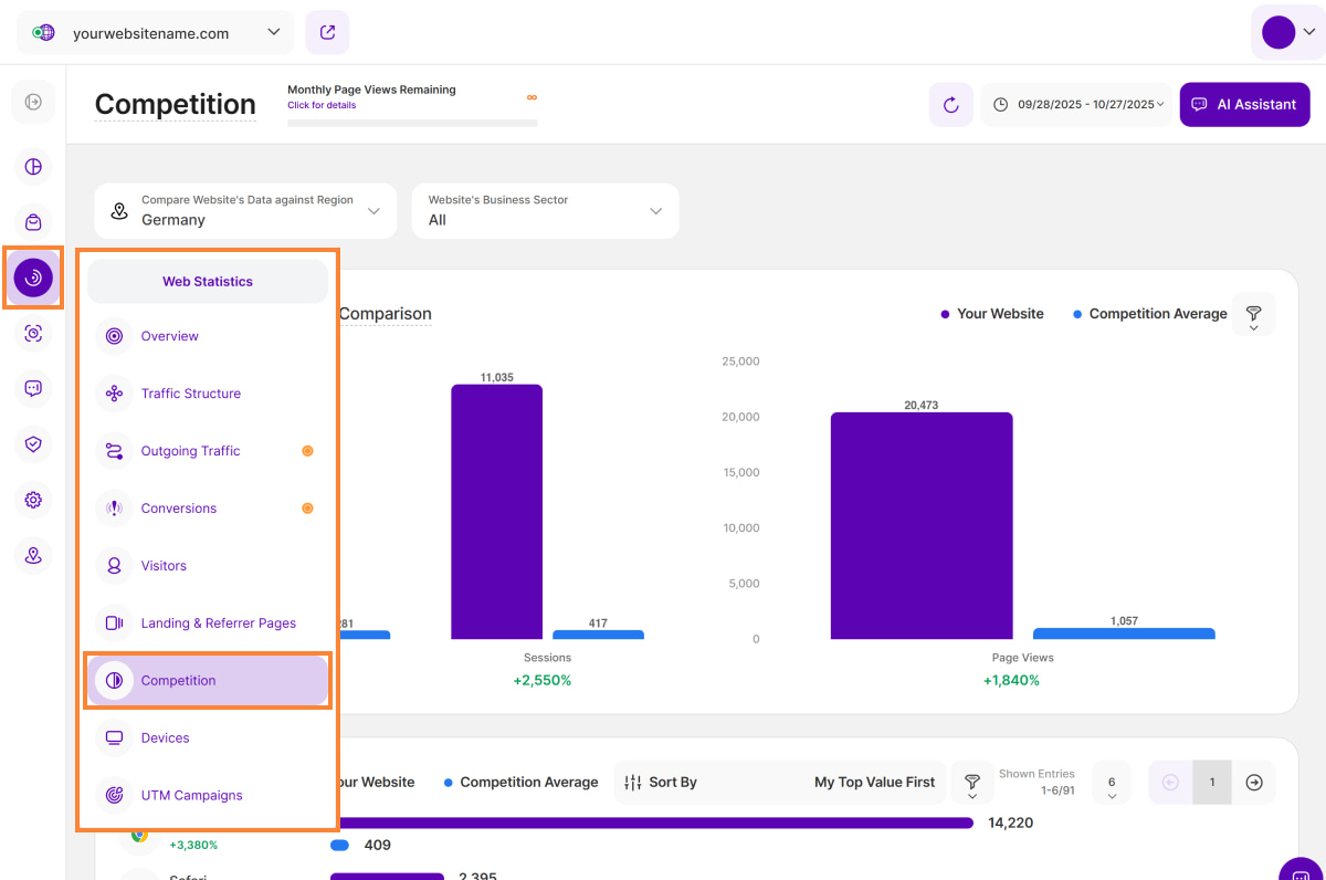 In the Competition submodule, you can compare your own website’s performance data against the respective averages generated by competing websites of a region and business sector you can select.