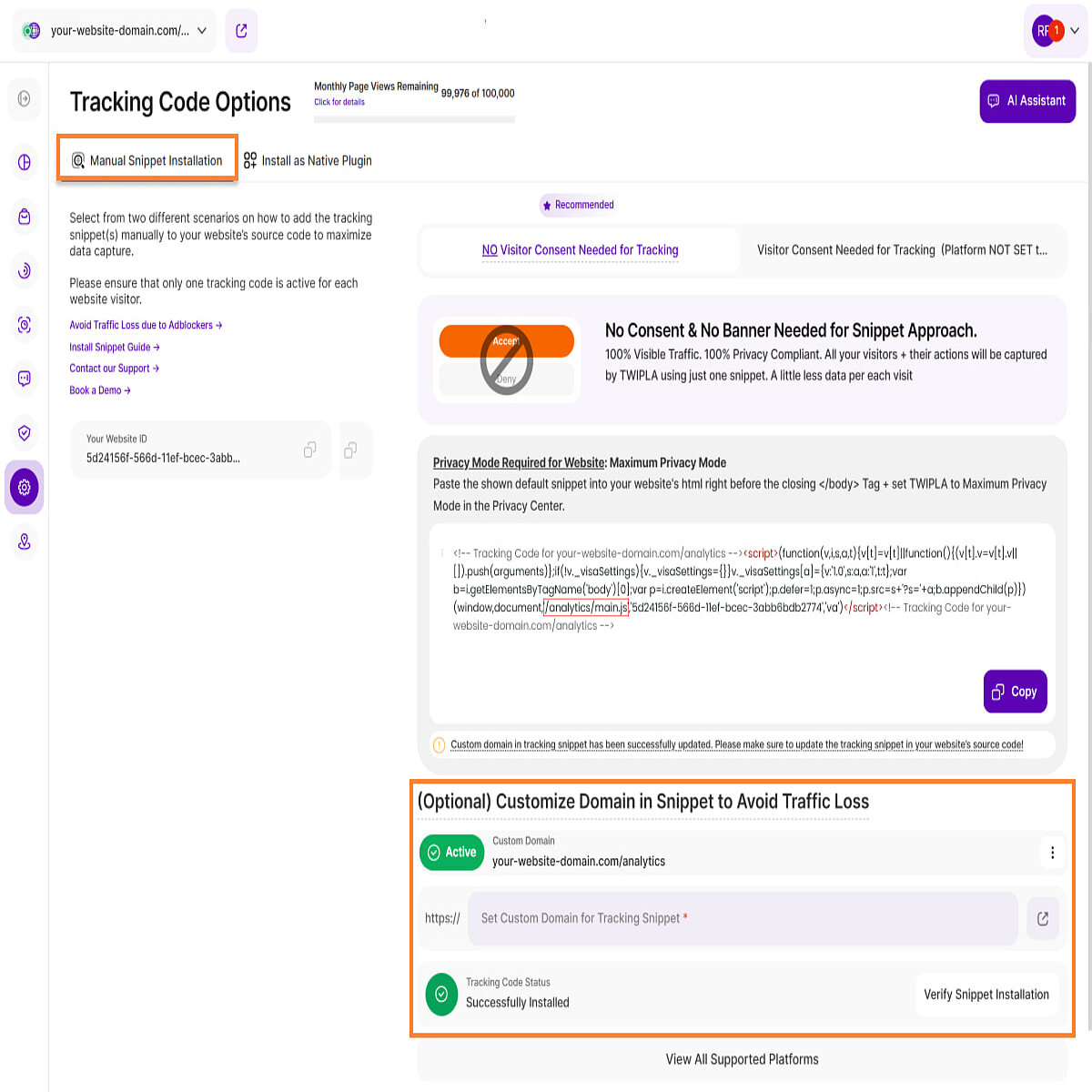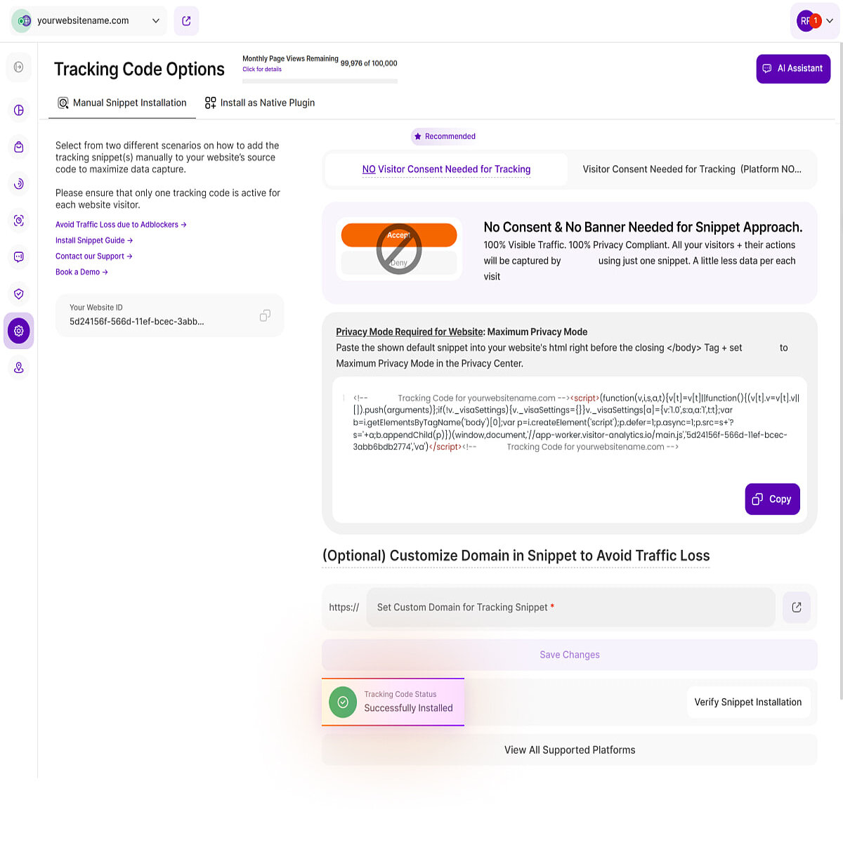 After selecting the data privacy mode for your website, choose between two tracking code options: [NO Visitor Consent Needed for Tracking(Recommended)] or [Visitor Consent Needed for Tracking