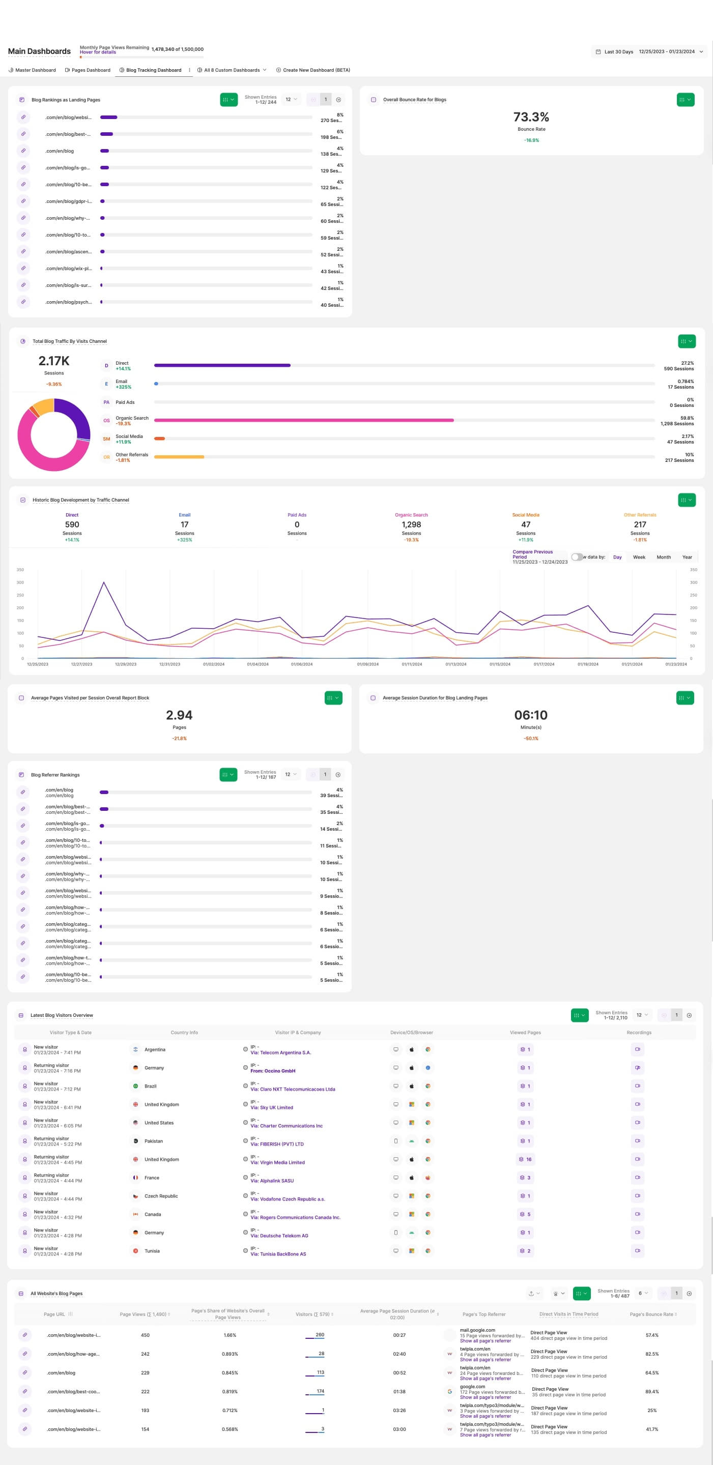 Tablourile de bord personalizate sunt, prin natura lor, foarte versatile, iar utilizatorii pot crea unul pentru aproape orice tip de site web imaginabil. Acestea pot fi utilizate pentru a monitoriza orice, de la urmărirea clicurilor până la activitatea de reluare a sesiunilor mobile, permițându-vă să creați rapoarte care să includă doar informațiile de care aveți nevoie. Fiecare bloc de rapoarte poate fi redenumit pentru a facilita referințele, iar filtrele pot fi activate în mod implicit pentru a afișa doar datele de care aveți nevoie.