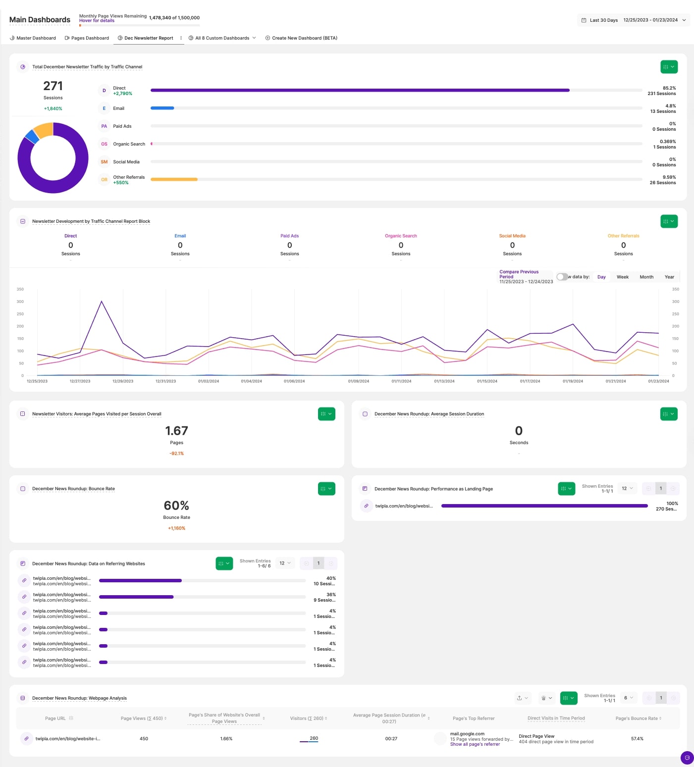 | Blocul de raport implicit al traficului total al site-ului web în funcție de canalul de trafic | Traficul total al buletinului informativ din decembrie în funcție de canalul de trafic | Pagina URL [Conține] /website-intelligence-news-roundup-decembrie-2023 |