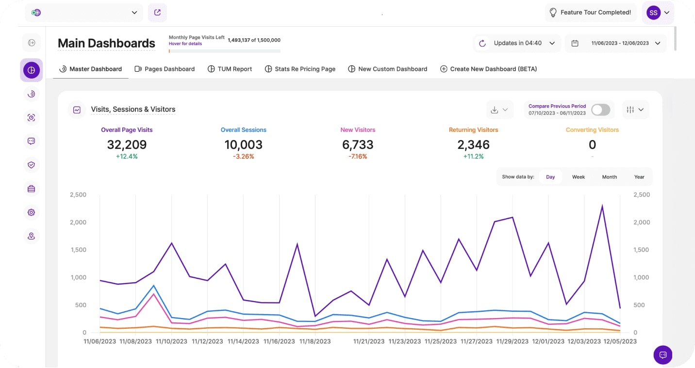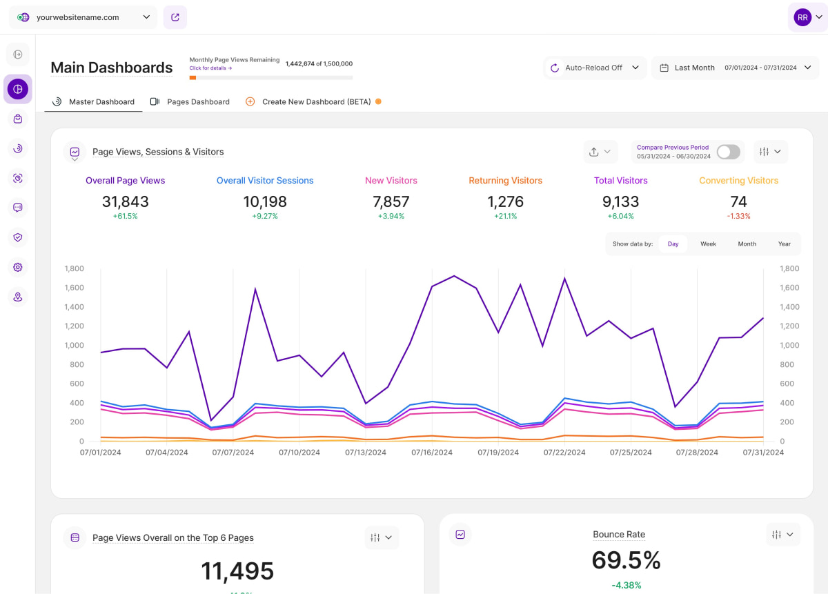 Accesați tabloul de bord principal atunci când doriți să obțineți o imagine de ansamblu a performanței site-ului web și când doriți să vedeți parametrii cheie privind vizualizările de pagini, ratele de respingere și activitatea generală a vizitatorilor.