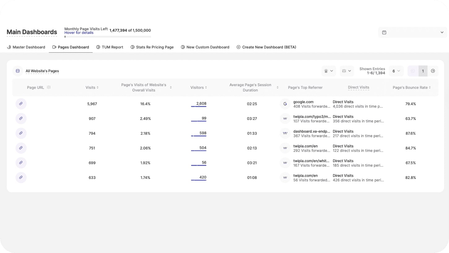 Oferim trei tipuri de tablouri de bord - Principal, al Paginilor și Personalizat. Acestea sunt alcătuite din diferite blocuri de rapoarte și afișează date în timp real, care pot fi vizualizate istoric sau comparate cu alte perioade de timp.