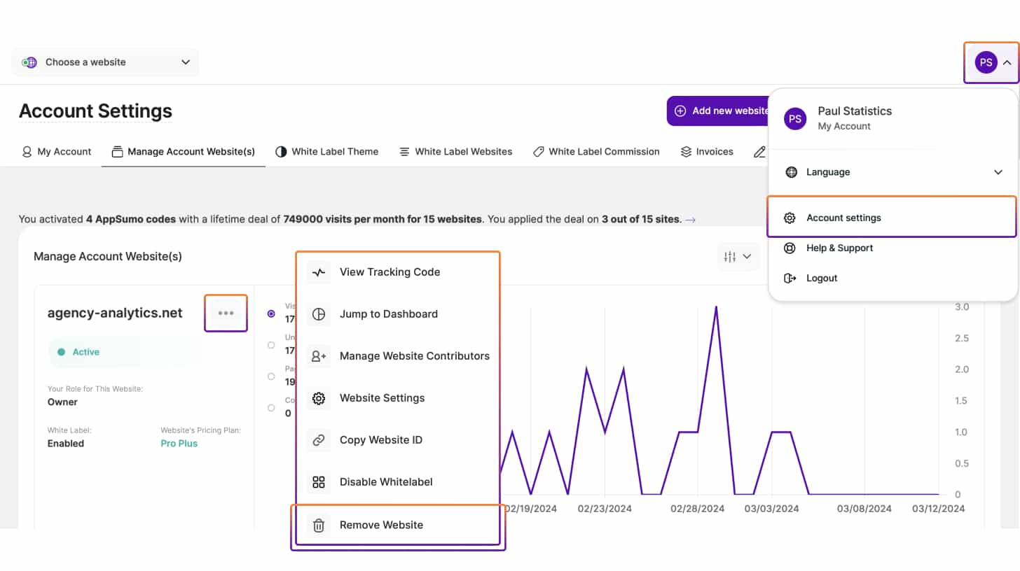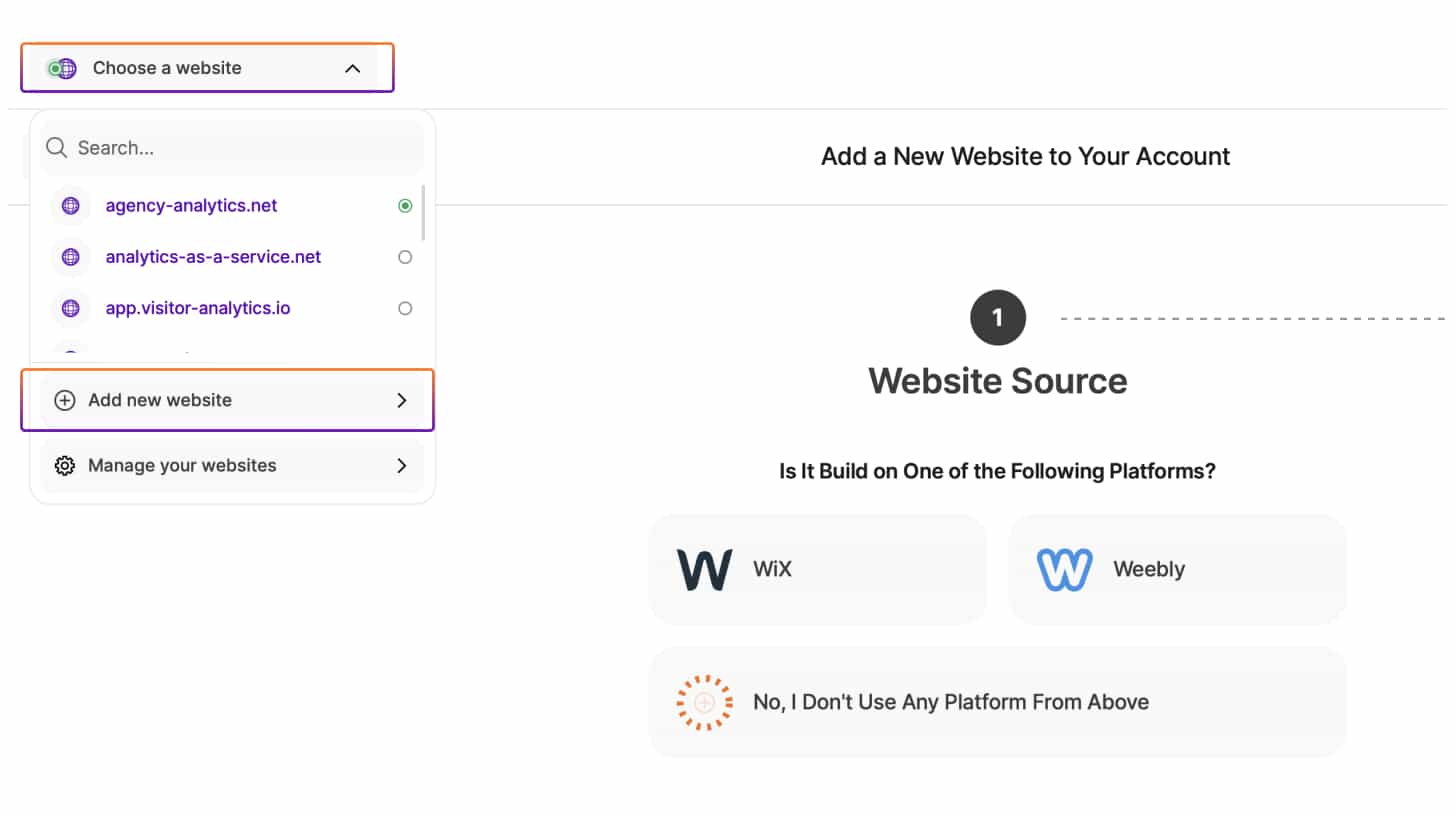 Notă: Puteți adăuga la cont câte site-uri web doriți după ce acești pași de integrare sunt finalizați. Faceți acest lucru făcând clic pe numele site-ului dvs. în platformă în colțul din stânga sus al ecranului, selectând Adăugare site nou și urmând instrucțiunile furnizate.