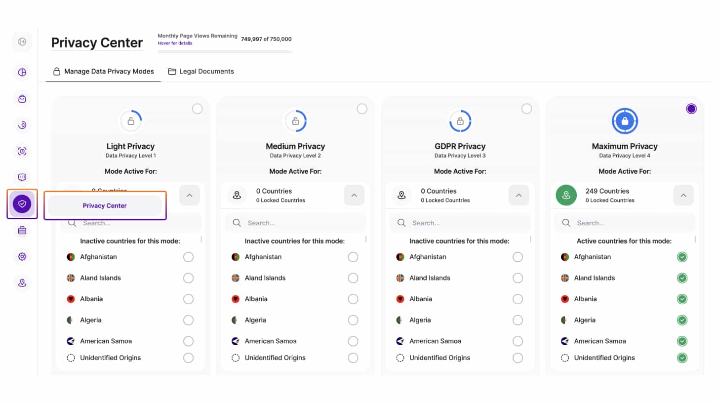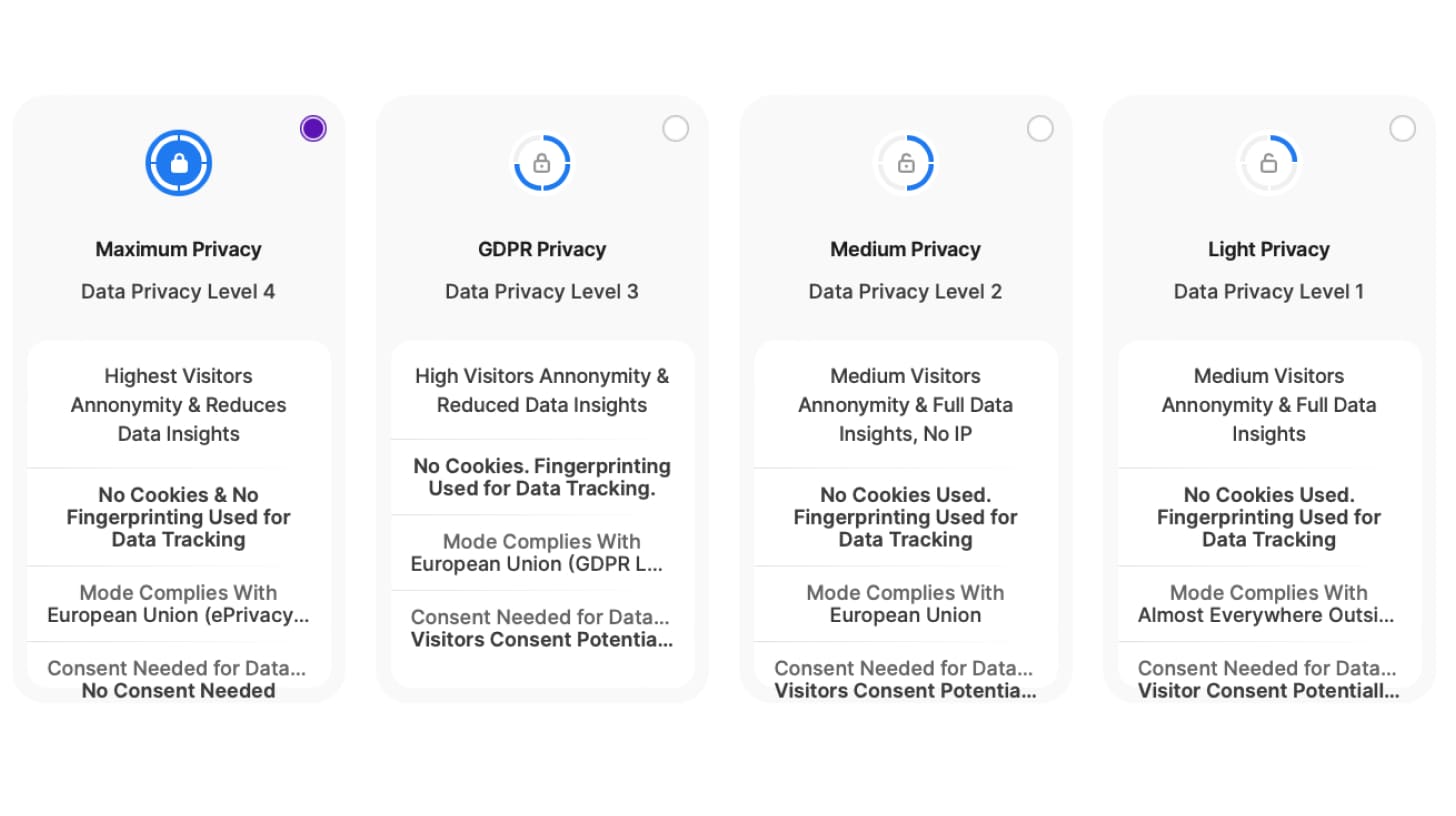 Acum vi se va cere să selectați modul de confidențialitate pentru întreaga platformă din patru opțiuni. Alegeți Modul de confidențialitate maximă și îndepliniți toate cerințele globale fără responsabilități juridice suplimentare. Alternativ, alegeți un mod de confidențialitate mai scăzut, adoptați măsurile de conformitate necesare și colectați în mod legitim seturi de date mai detaliate pentru fiecare vizitator în parte.