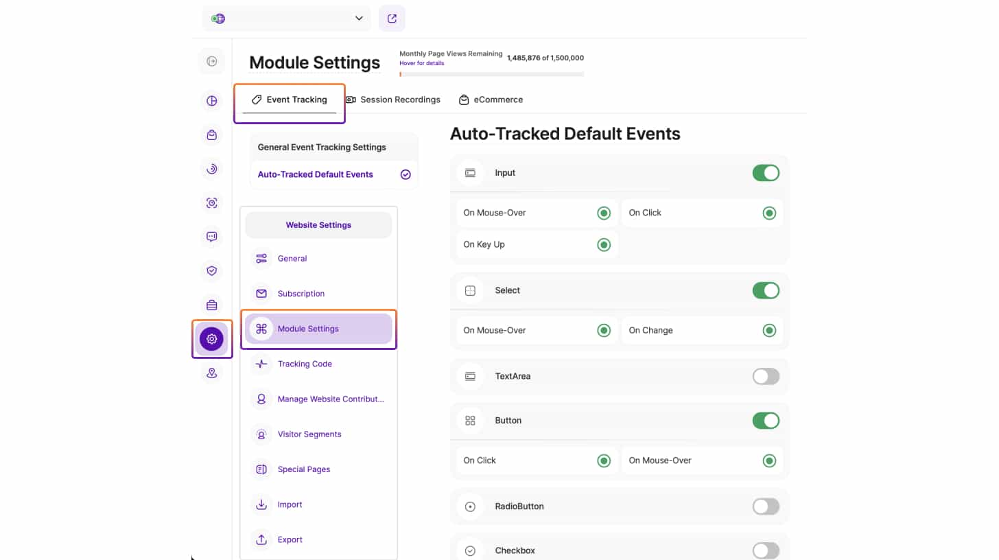 - Asigurați-vă că urmărirea manuală a evenimentelor este activată. Accesați Setări site web din meniul vertical cu pictograme din stânga. Faceți clic pe Setări modul. Activați Urmărirea etichetelor de eveniment create manual.