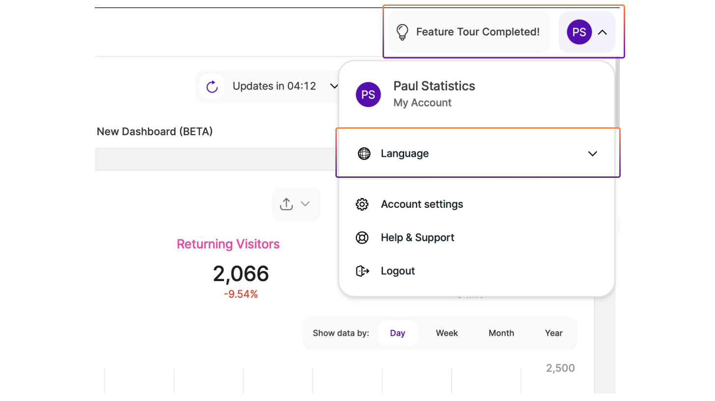 Pentru a schimba limba, deschideți Selectorul de limbă derulant din colțul din dreapta sus al ecranului din aplicație și selectați limba dorită din listă. Limba se va schimba apoi imediat de-a lungul platformei și fără a fi nevoie să reporniți sau să reîmprospătați. De asemenea, acest proces poate fi repetat ori de câte ori este necesar.