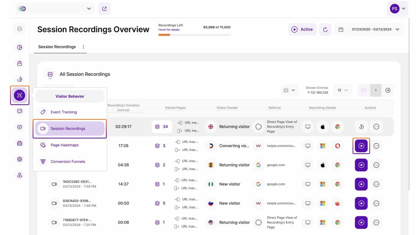 - Accesați Comportamentul vizitatorului din meniul vertical din stânga și faceți clic pe Înregistrările sesiunii.