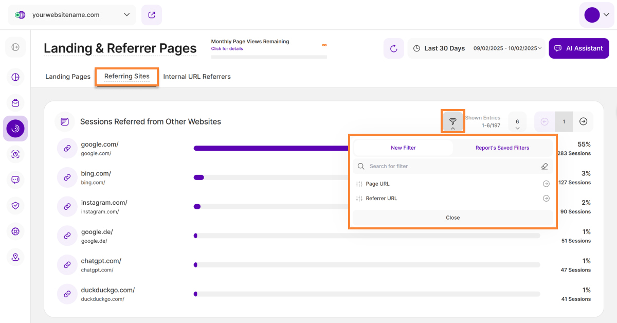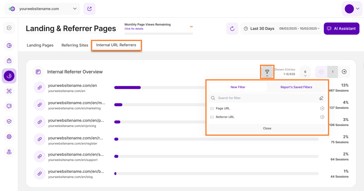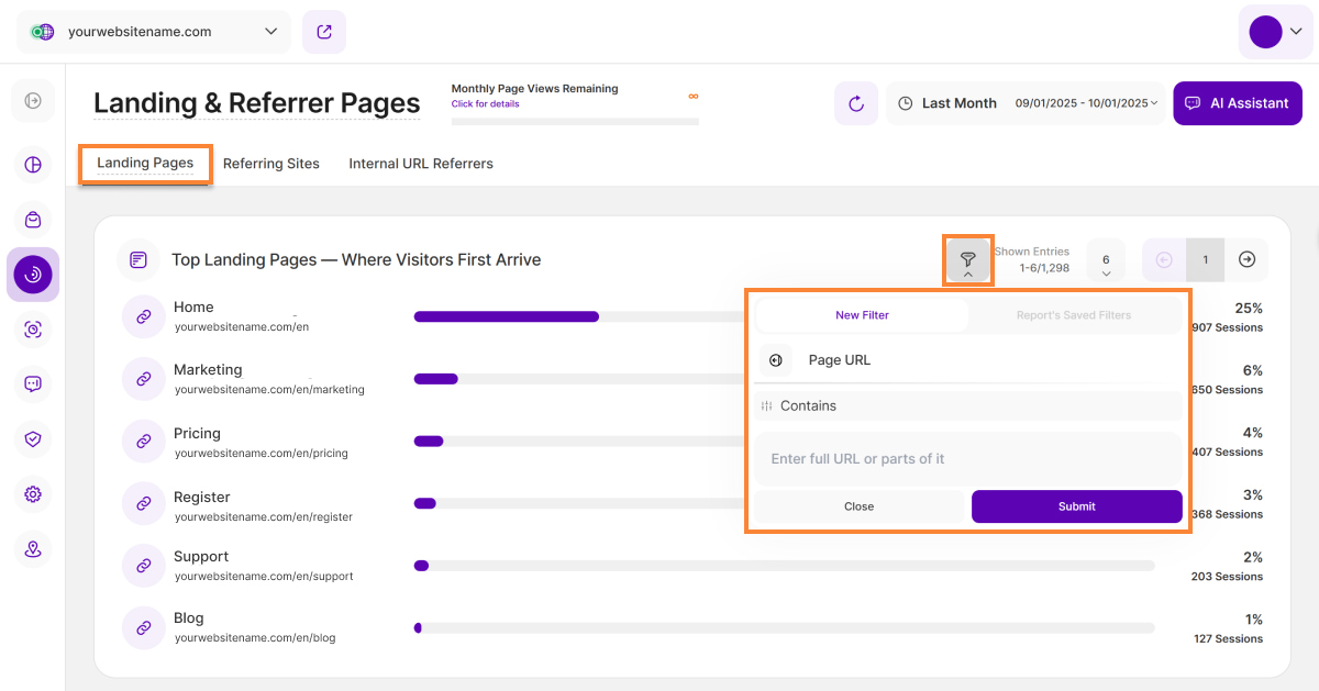 Îmbunătățiți analiza paginilor de destinație cu funcția noastră de filtrare ușor de utilizat. Acum vă puteți concentra pe anumite pagini pentru a obține o înțelegere reală a performanței acestora.