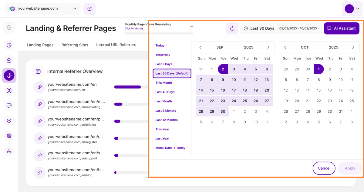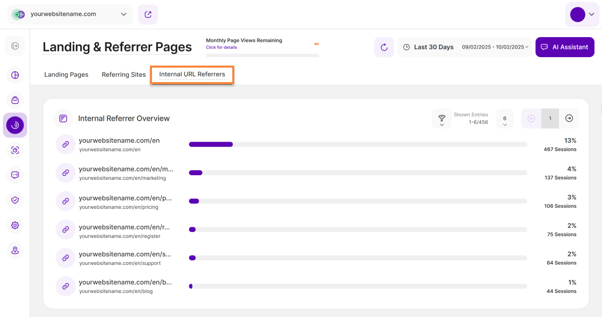 Modulul Referințe URL internelistează toate paginile de pe site-ul dvs. care au primit trafic de la vizitatori care au mai fost deja pe site-ul dvs. Cu alte cuvinte, arată care pagini au fost accesate prin link-uri interne de pe alte pagini - excluzând sursele externe sau accesările directe.