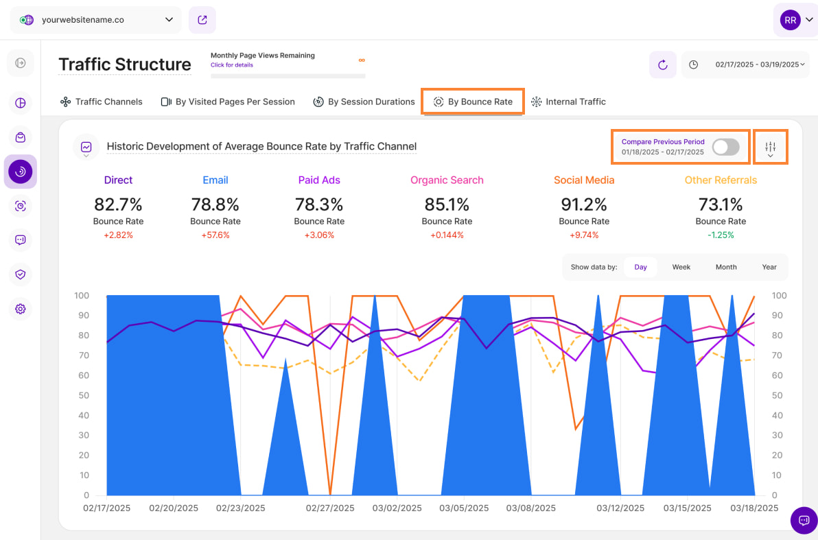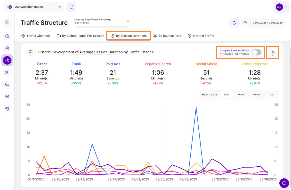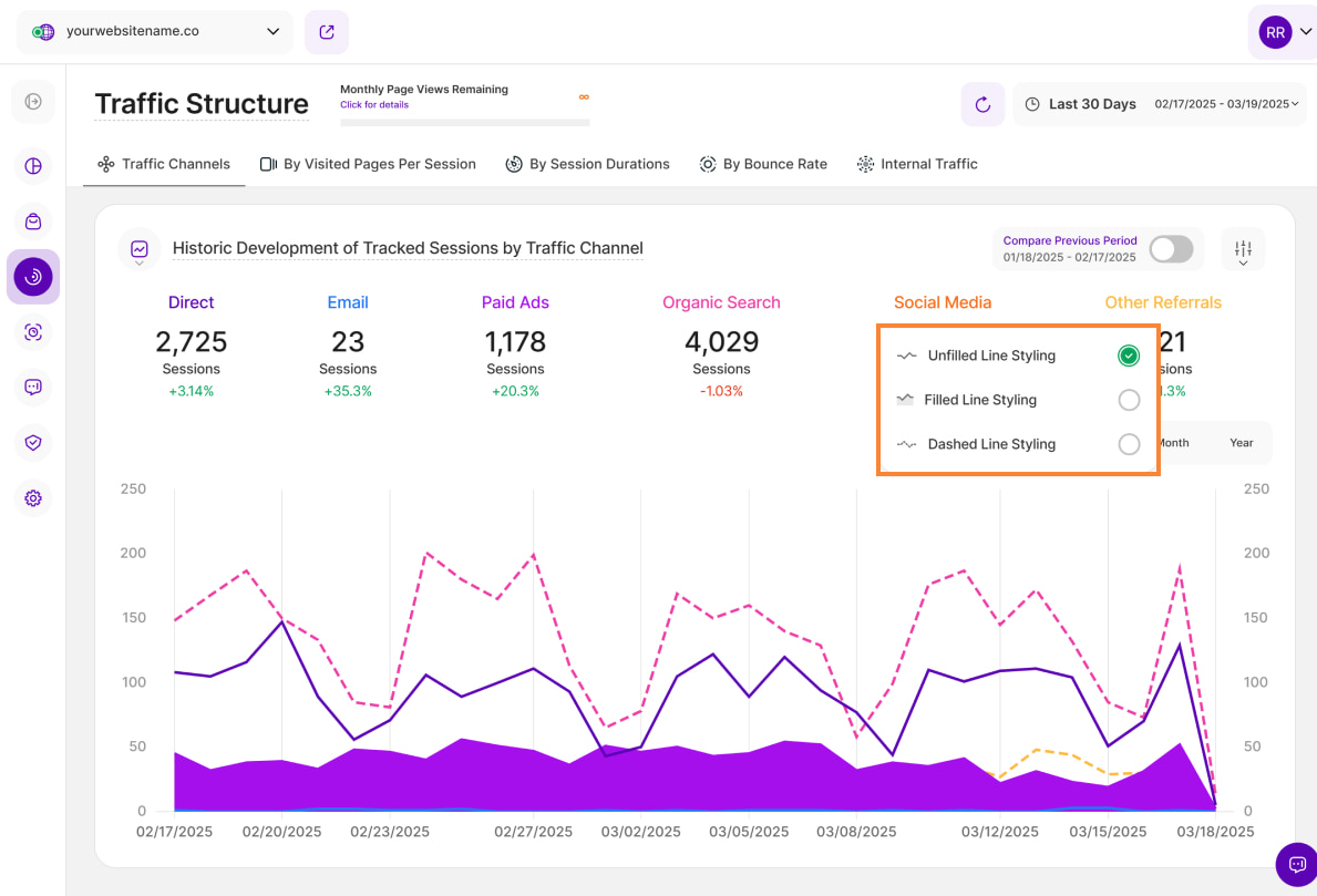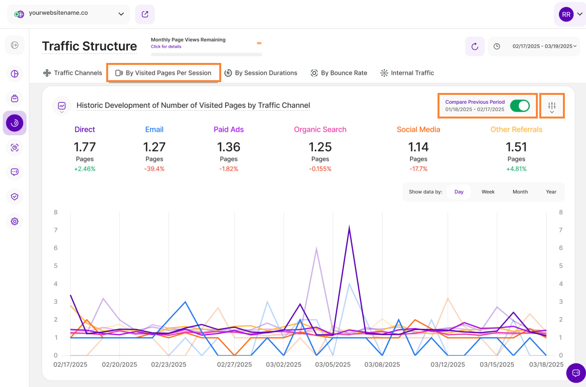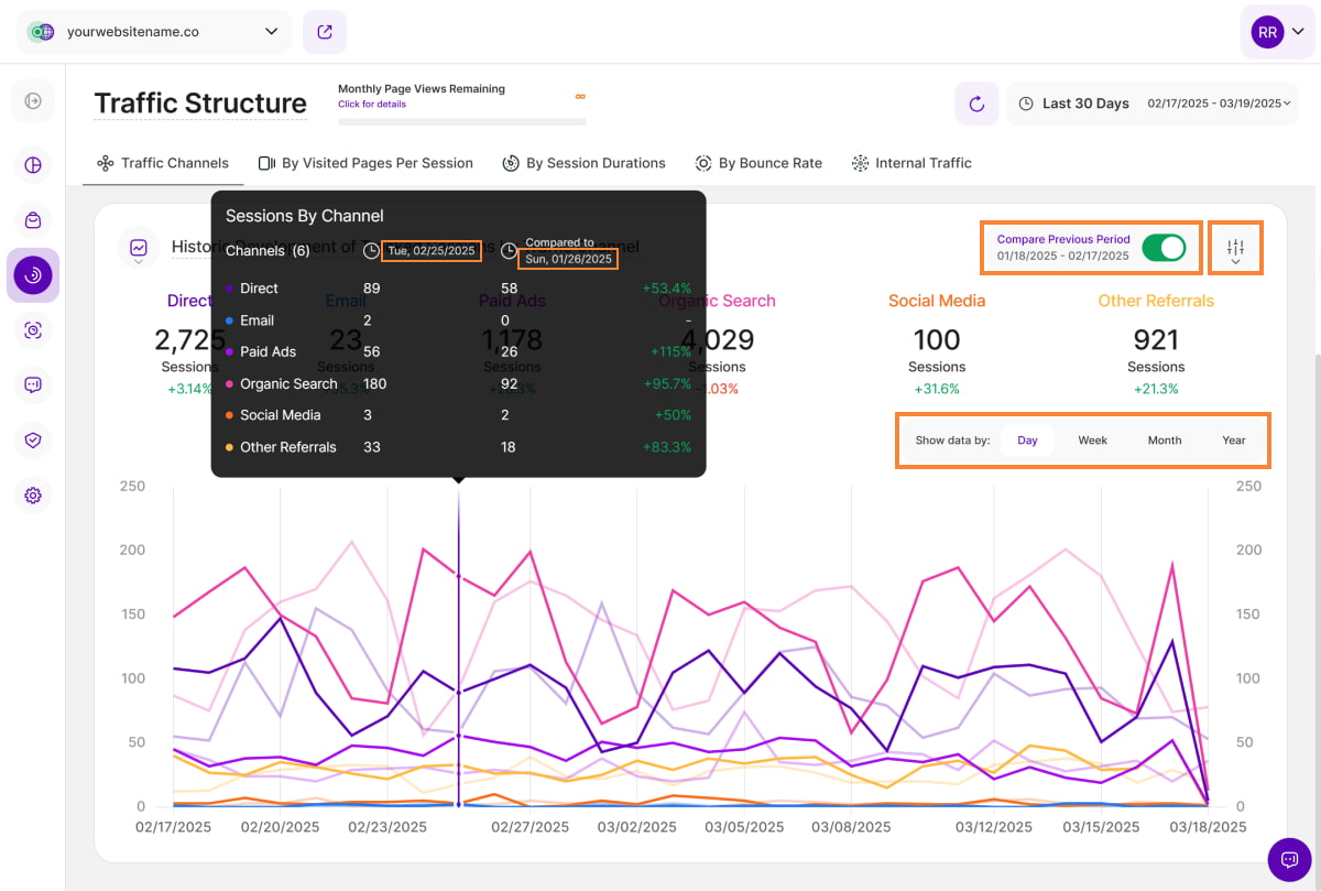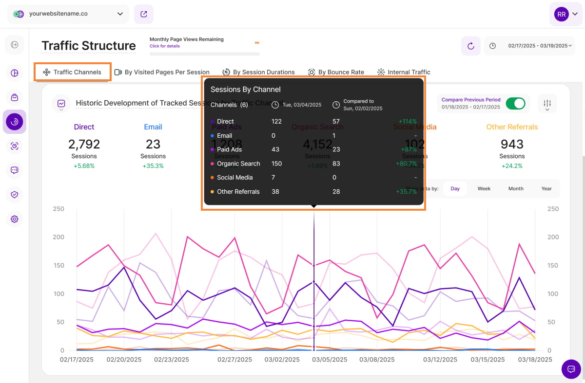Ca și pagina anterioară, această vizualizare conține un bloc de raport care afișează o diagramă liniară. Această pagină dezvăluie modificările istorice ale sesiunilor site-ului, arătând câte pagini au accesat vizitatorii din fiecare canal de trafic în intervalul de timp ales.