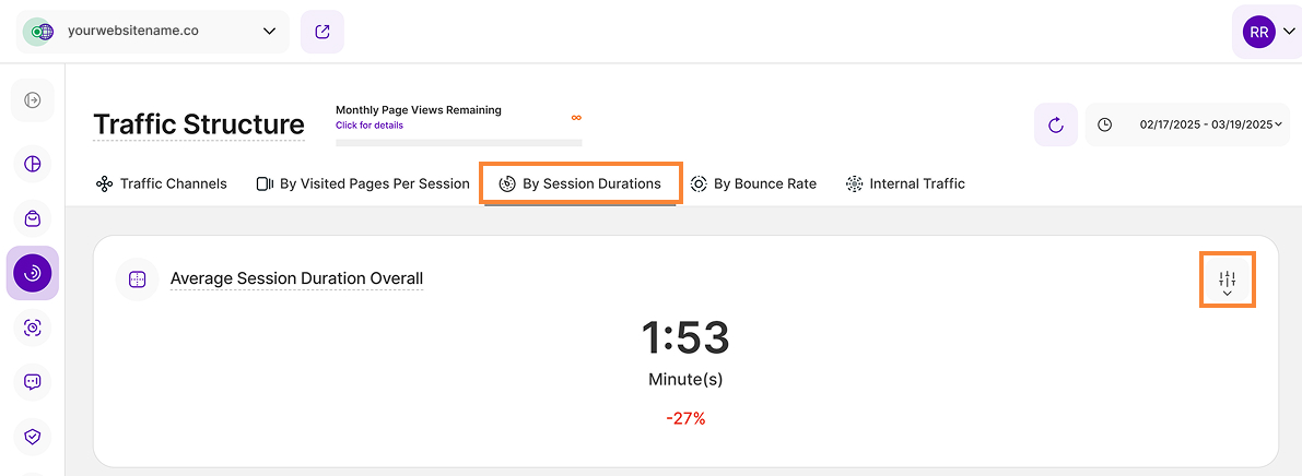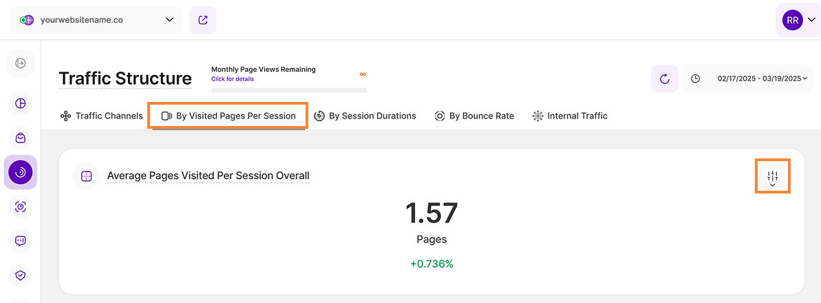 Această secțiune dezvăluie numărul mediu de pagini explorate de vizitatori pe sesiune, ajutându-vă să identificați canalele de trafic care îi țin în suspans. Calculăm acest parametru pe baza tuturor sesiunilor vizitatorilor din intervalul de timp ales, asigurând acuratețea.
