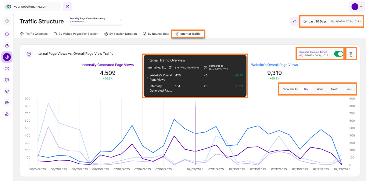 Graficul afișează vizual proporția afișărilor de pagină, permițând compararea istorică a traficului generat intern cu afișările totale de pagină ale site-ului. Selectați ambele opțiuni pentru a vizualiza tendințele generale sau izolați o singură sursă pentru o analiză detaliată.