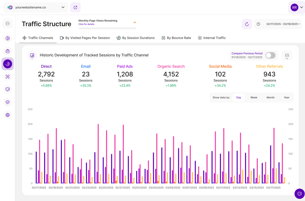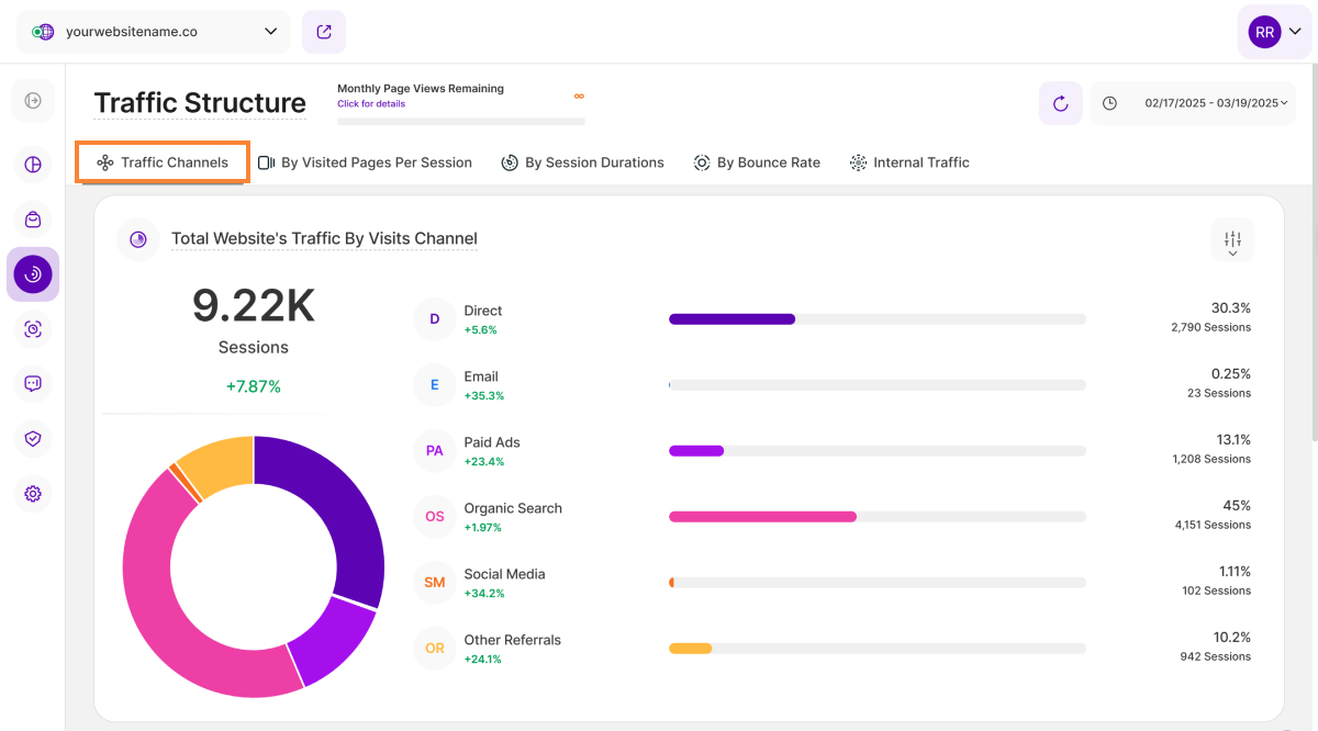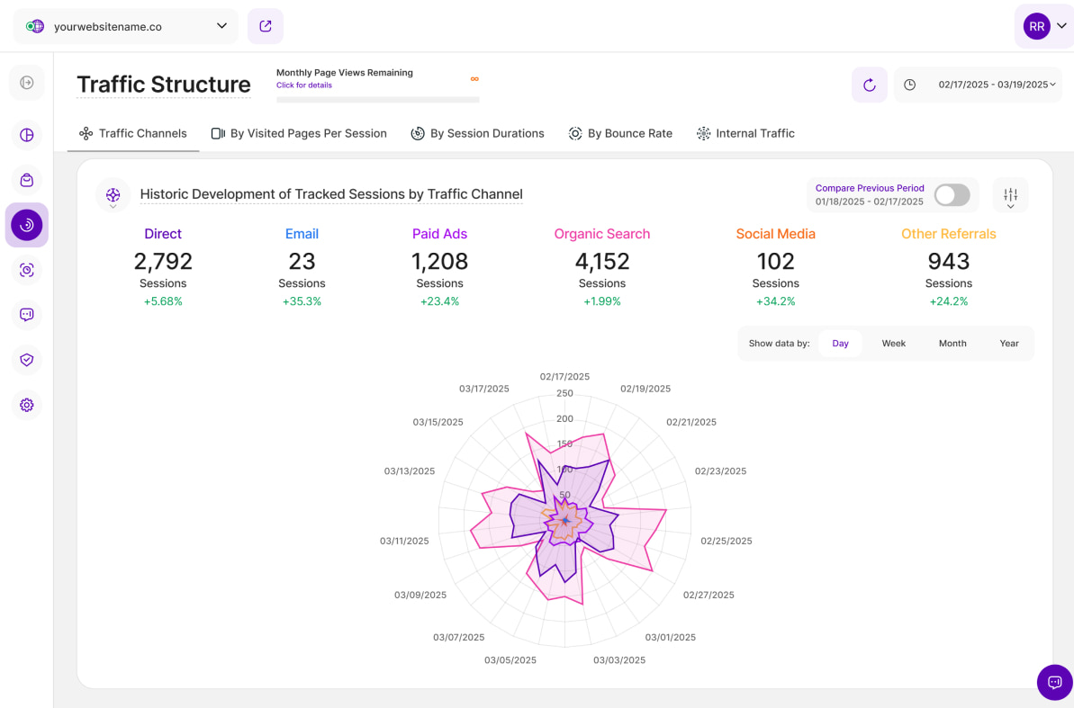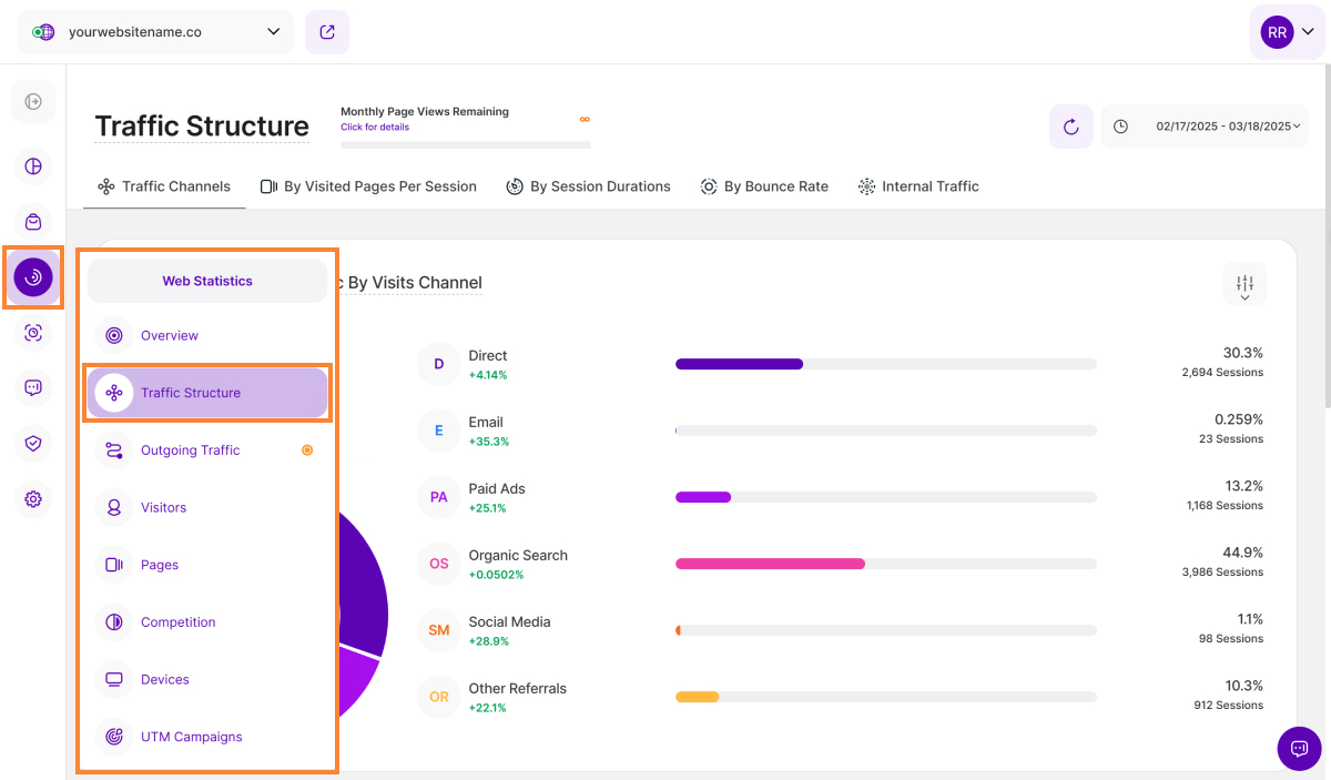 În cadrul submodulului Structura traficului, veți găsi detalii complete despre modul în care este organizat traficul de intrare pe site-ul dvs. web.